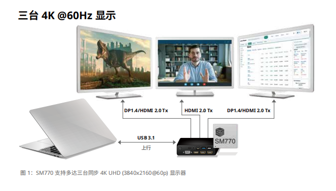 SM770 是一款高性能USB显示接口SoC,支持多达三台4K超高清(3840x2160@60p)显示器同时连接。基于慧荣科技创新的 CAT™(内容自适应技术),采用多种图像和视频处理算法来压缩显示数据,同时最大限度地减少带宽使用,从而实现从计算机到显示器的超低延迟。CAT™技术将大部分压缩工作转移到硬件加速器上,可以更高效地运行并降低CPU负载。