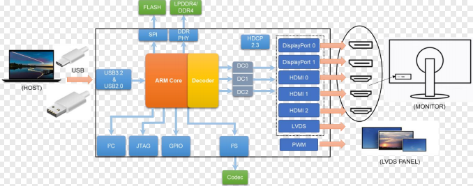 SM770配备丰富的内置显示接口(HDMI 、DP和LVDS),可直接连接到监视器和电视。片上视频和解码 器有助于降低系统CPU利用率和视频显示的总线带宽使用。