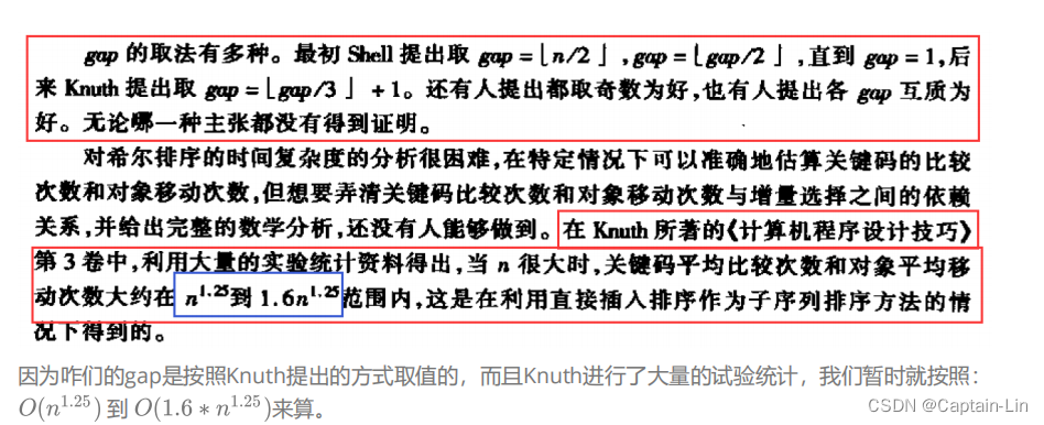 - 希尔排序的时间复杂度不好计算,因为gap的取值方法很多,导致很难去计算,因此在好些树中给出的希尔排序的时间复杂度都不固定,我们可以使用Knuth的取值或者大概平均值O(n^1.3),对比下略差于O(n*logn)的算法