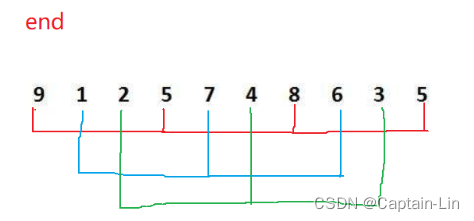 至此,我们第一组(红色组)就排完了,数组将会变成 5,1,2,5,7,4,8,6,3,9