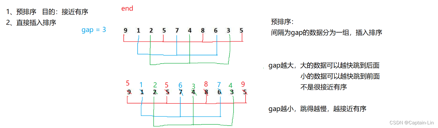 - 只需要将第二层循环 i += gap 变为 ++i 即可,可以理解红组,然后红组9,5拍完,蓝组1,7排,蓝组排完绿组2,4排,以此类推。