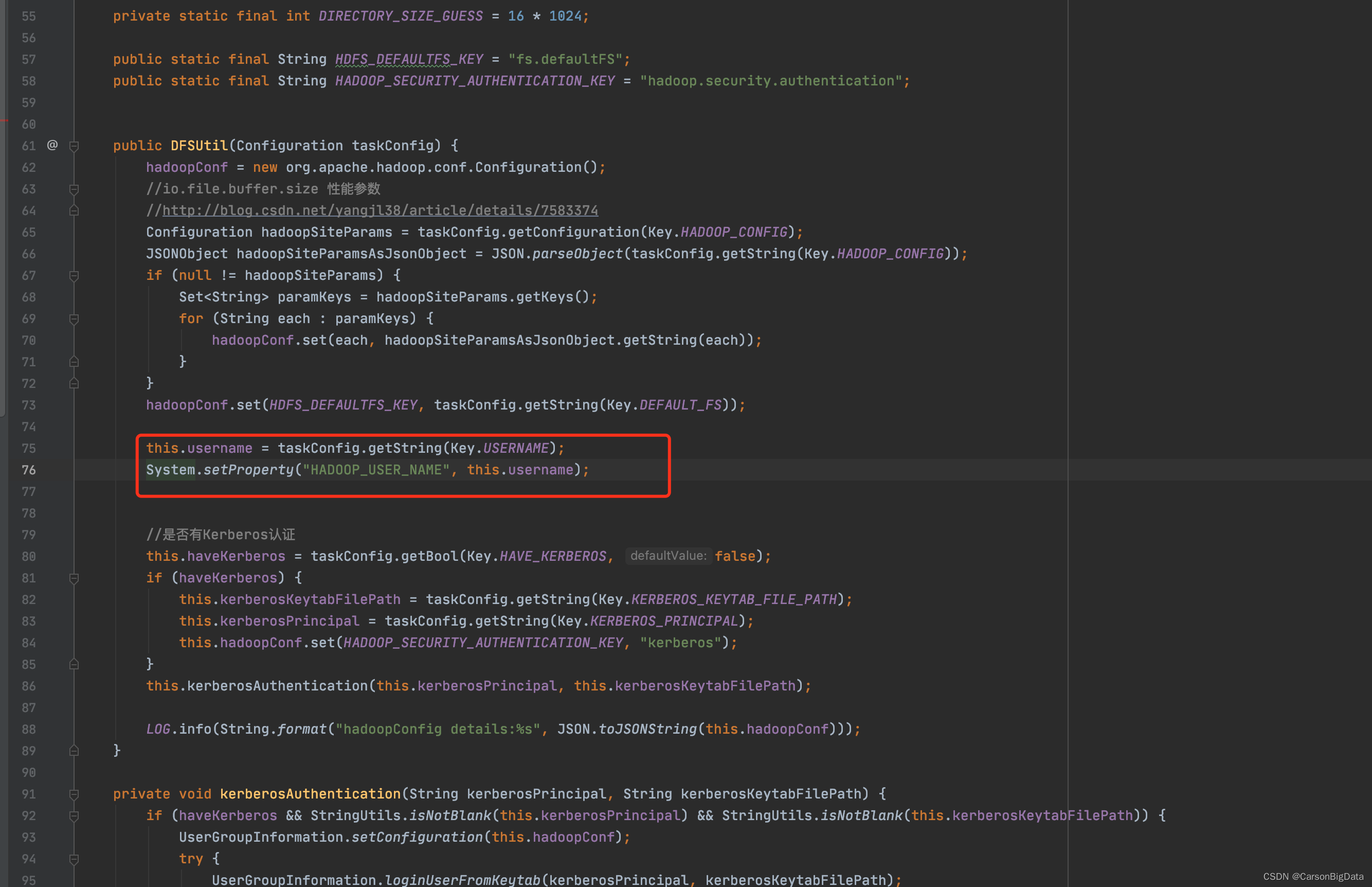 2、在DFSUtil类初始化时,修改HADOOP_USER_NAME为模版传入的用户,目前用户未开启认证,所以修改用户名称即可