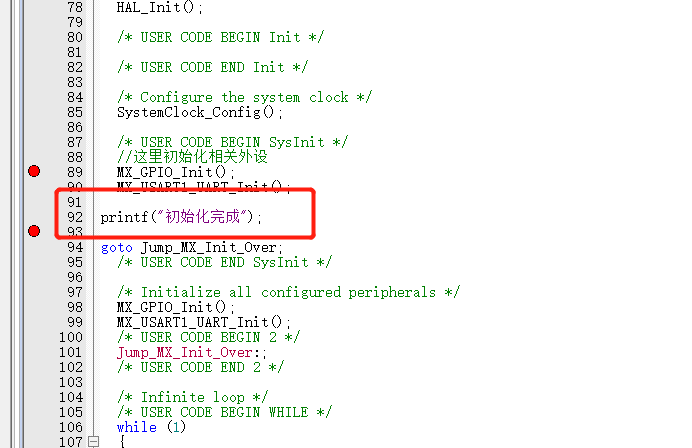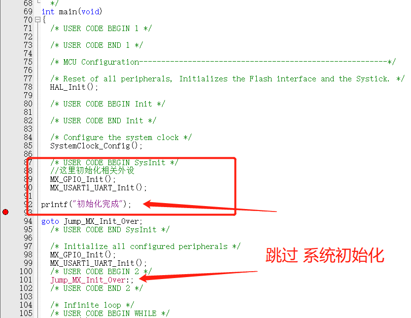 在main函数中使用goto语句跳过初始化, (其实也不是跳过初始化, 而是跳过系统自动生成的部分,使用用户代码部分中的初始化, 来避免更改配置后被重置的一些问题。 )