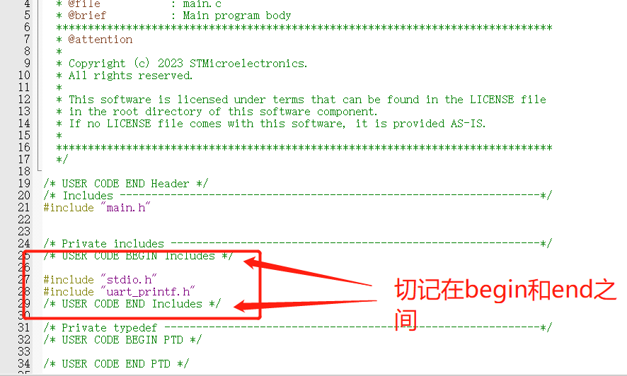 接着在生成的代码中 添加头文件。 注意, 用户代码必须严格的写在USER CODE BEGIN和END之间, 否则容易被重置掉。
