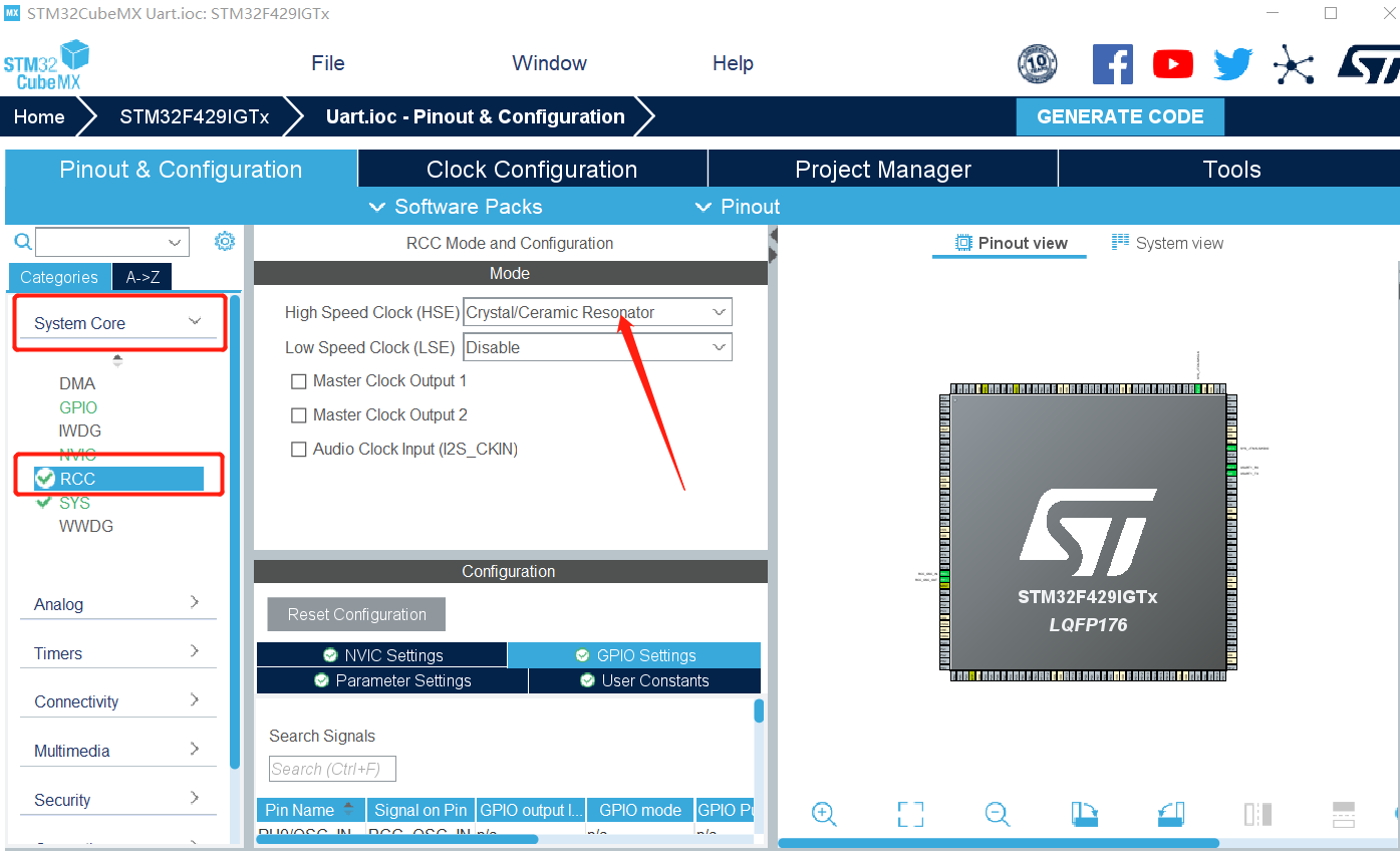 在系统内核中,配置系统时钟。在mode中, 选择使用外部晶振。