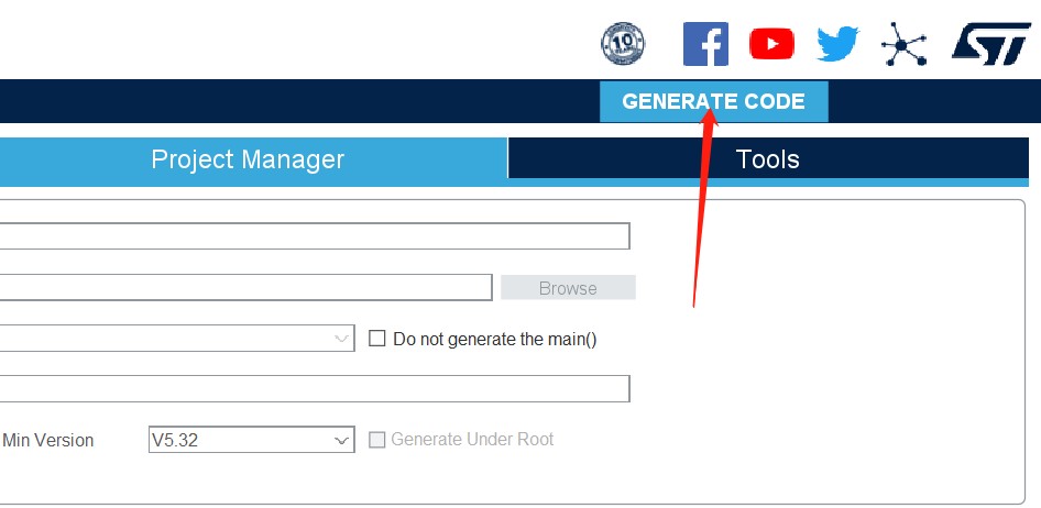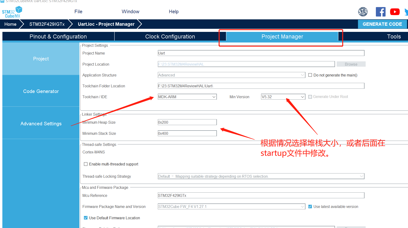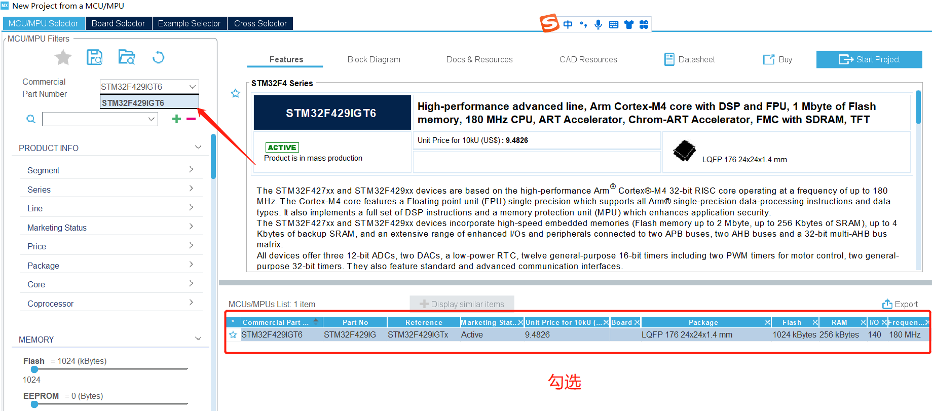 配置CubeMX ,选择芯片: 选择芯片后勾选右上角蓝色图标:"StartProject"