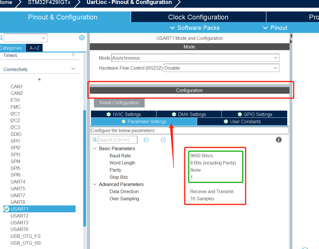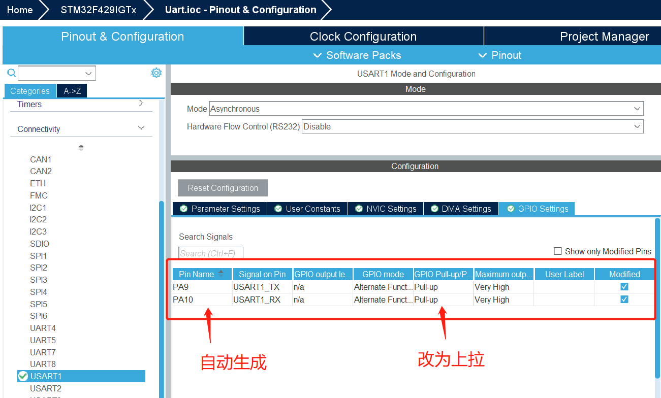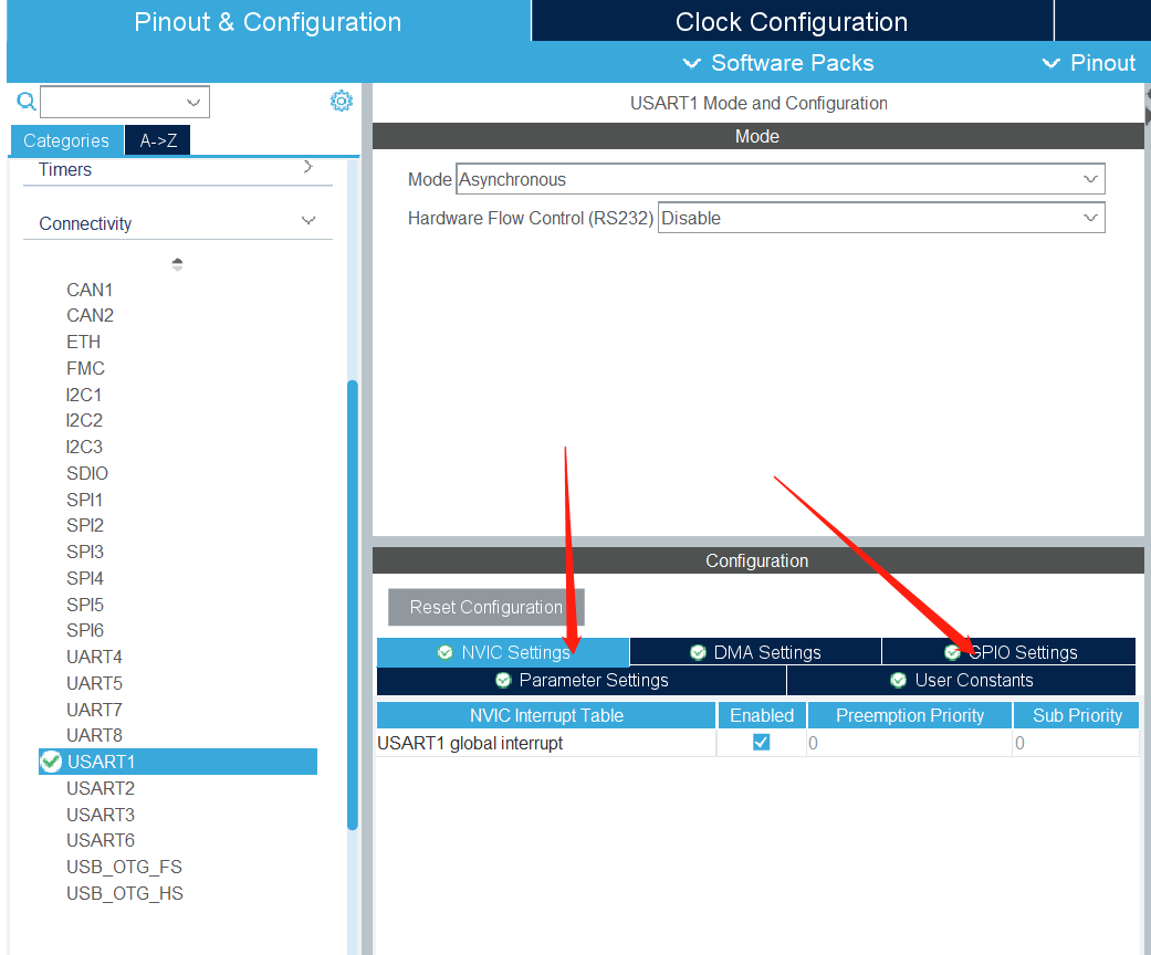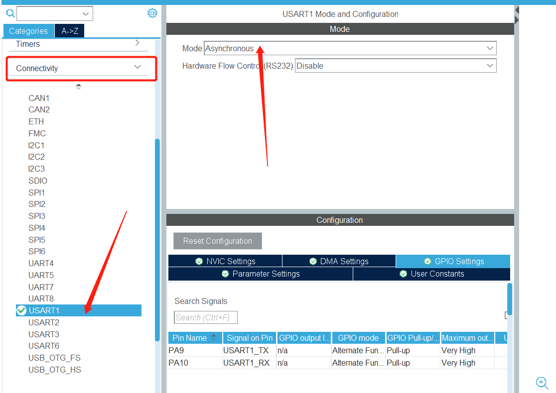 进入Connectivity选项卡配置 串口, 这里使用USART1, Mode选择为A,,, 即异步通讯。