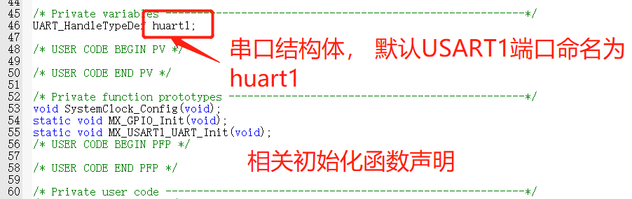 代码自动生成的相关外设,不用管。 如果printf使用的是USART1, 就将huart1的结构体删除, 因为我们把这个结构体的声明放在了uart_printf.h中