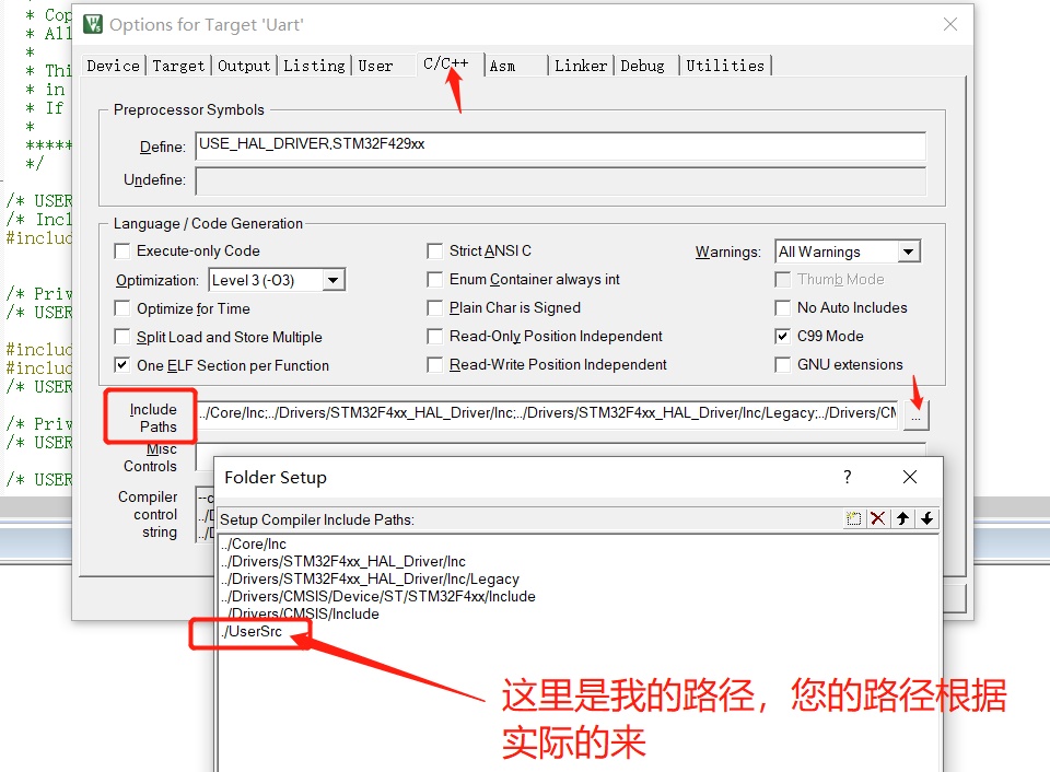 这里为了方便维护,将printf重新定向做了一个.c文件和.h头文件。 并命名为uart_printf.c和uart_printf.h. 保存在UserSrc的文件夹中。打开选项卡, 对刚做的头文件路径进行添加。(否则即使在代码中添加了#include“uart_printf.h”也会找不到, 头文件必须添加搜索路径。)