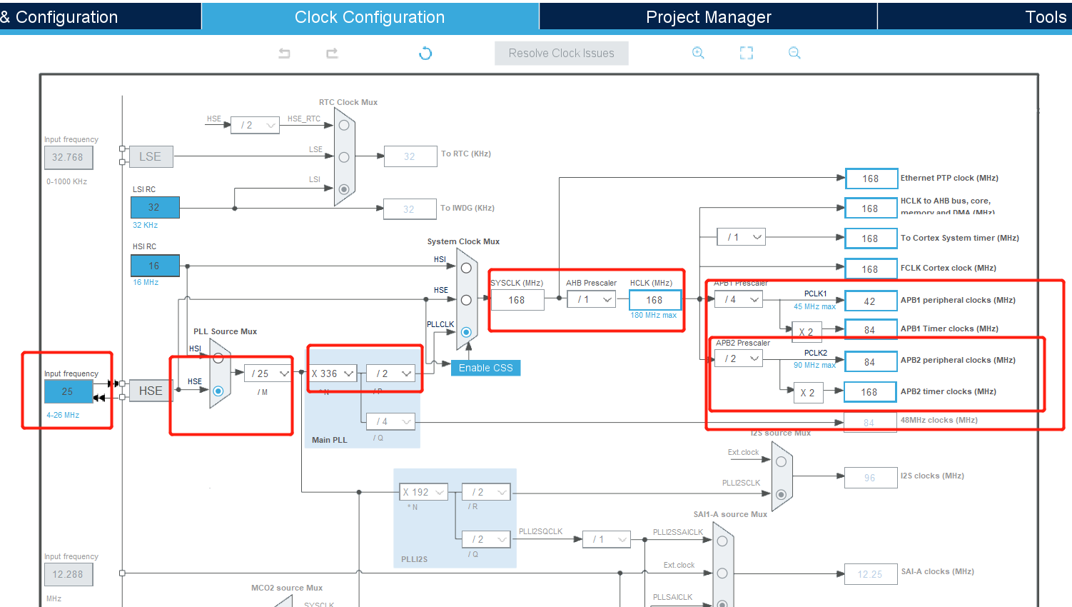 进入 Clock Configuration 进行时钟树的配置(根据外接晶振的实际情况配置)