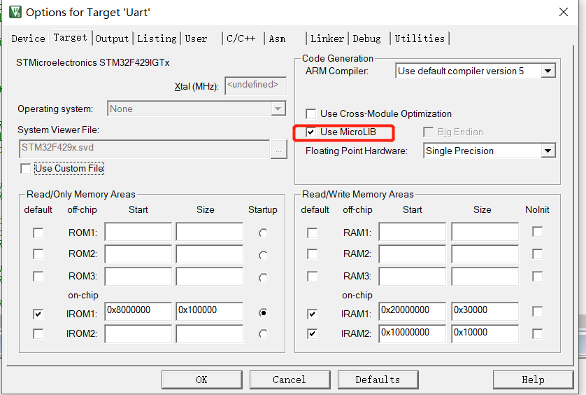 同时在选项卡中勾选使用微库。 (否则, 无法使用微库, 也就是说, 你添加了stdio或者string这样的C语言标准库,也无法使用。)