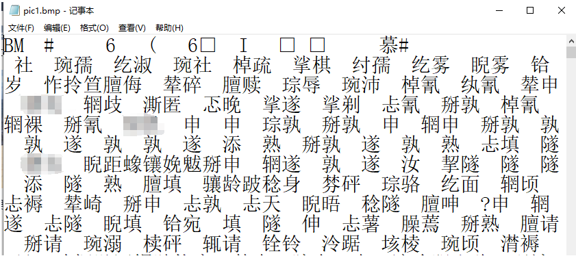使用记事本打开一个文件,如果显示内容为看不懂的乱码,则文件的类型为二进制文件。例如以下的24位位图文件pic1.bmp:(后续的程序需要使用此图片文件,请在图片上点击右键另存图片,注意保存时图片格式应为BMP)
