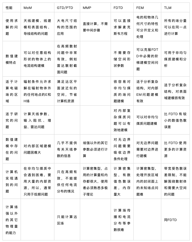 这里对计算电磁学中几种主要的数值方法进行简单的比较,即时域有限差分法(FDTD)、有限元(FEM)、矩量法(MoM)、多极子法(MMP)、几何光学绕射法(GTD)、物理光学绕射法(PTD)和传输线法(TLM)。