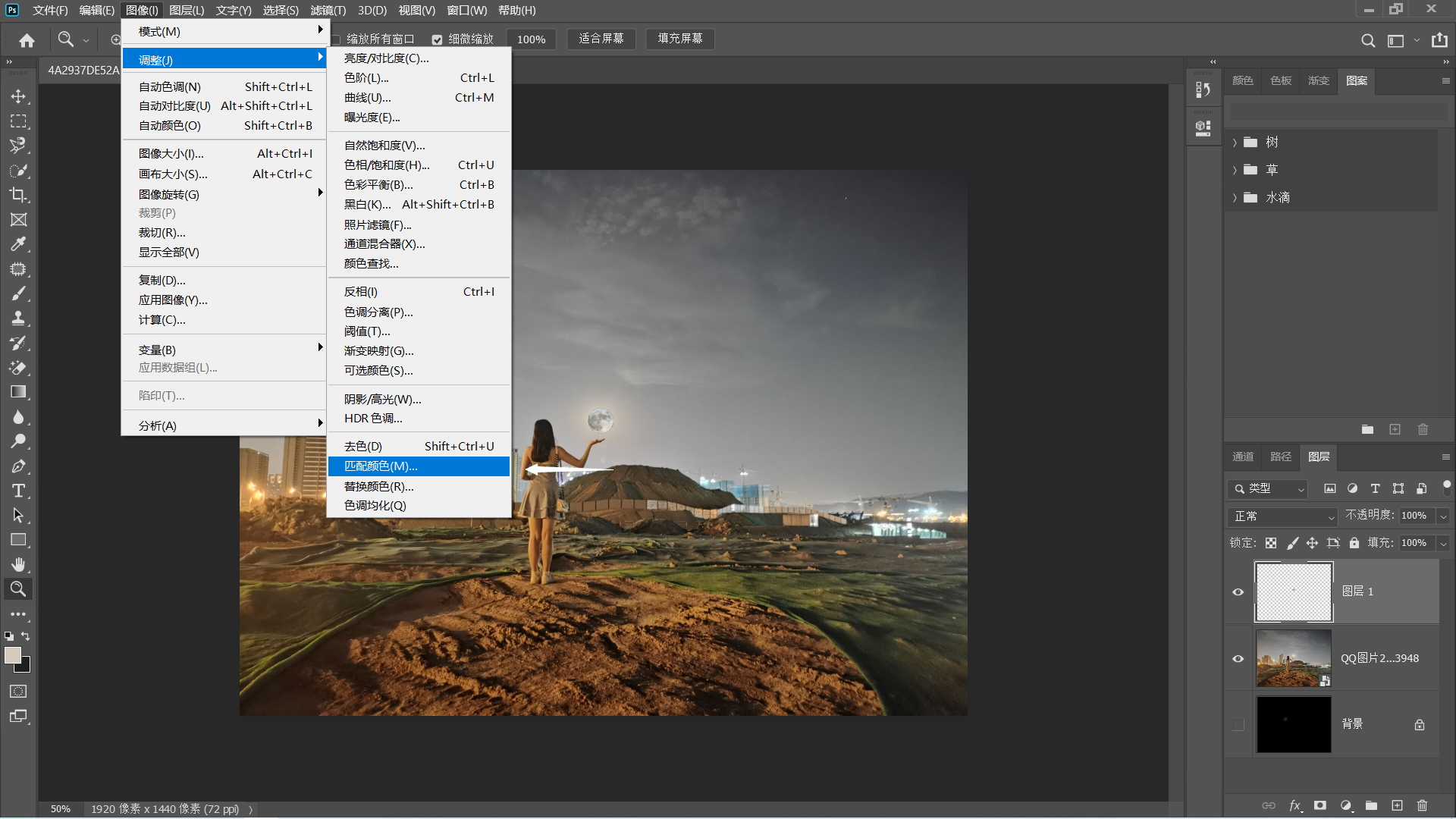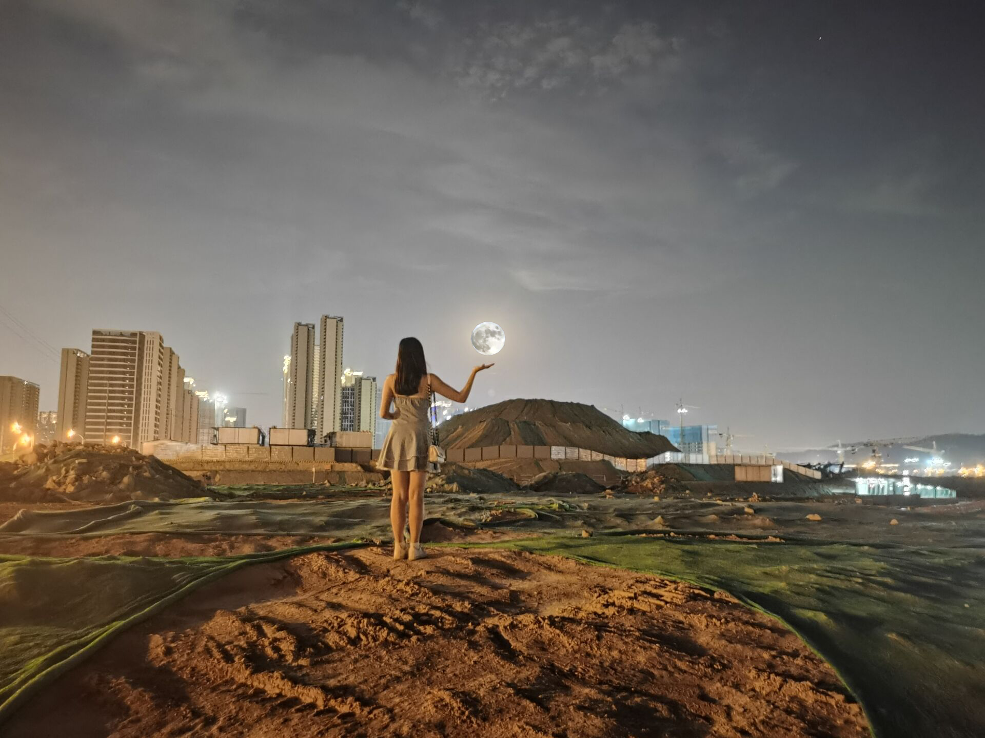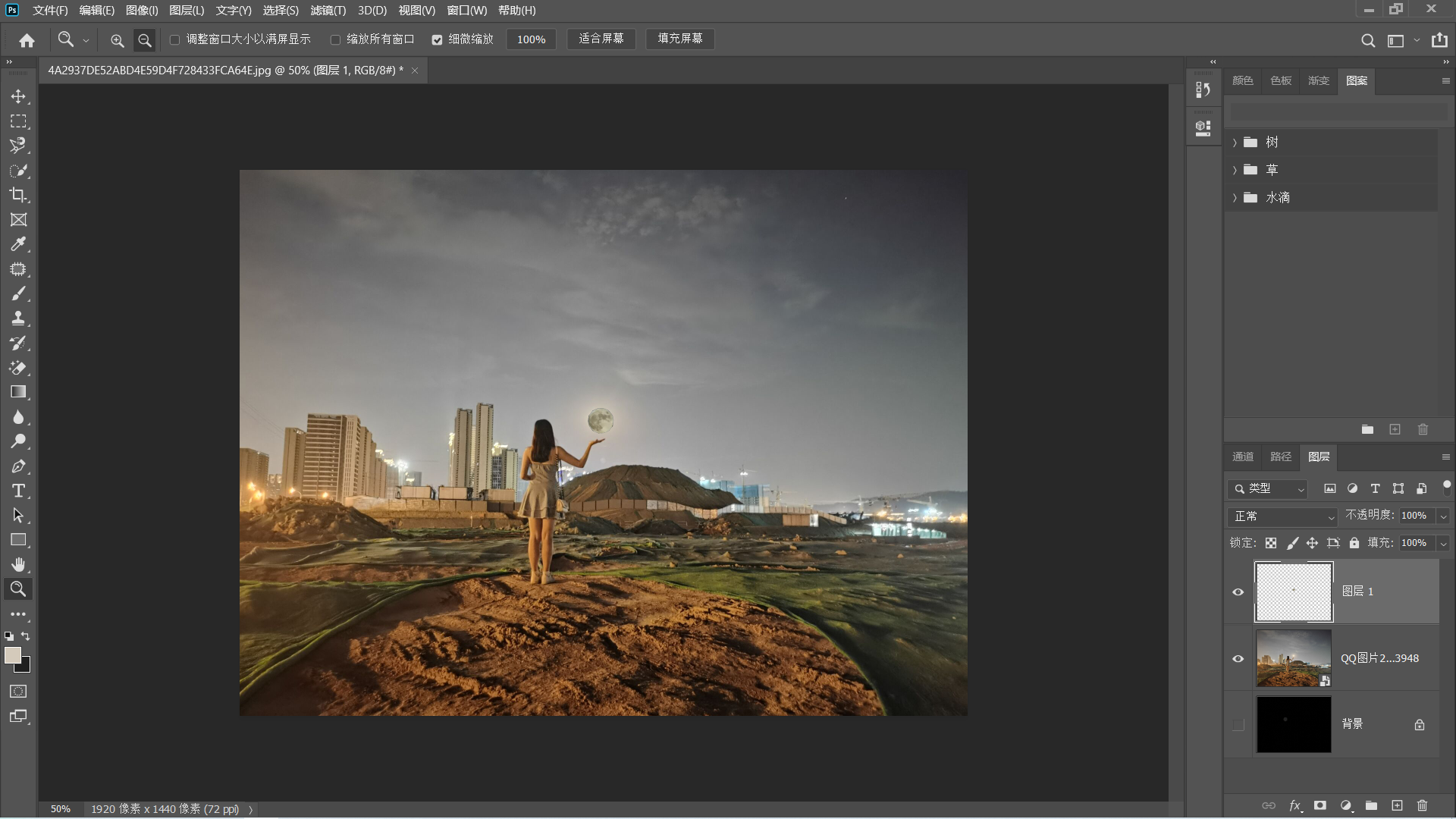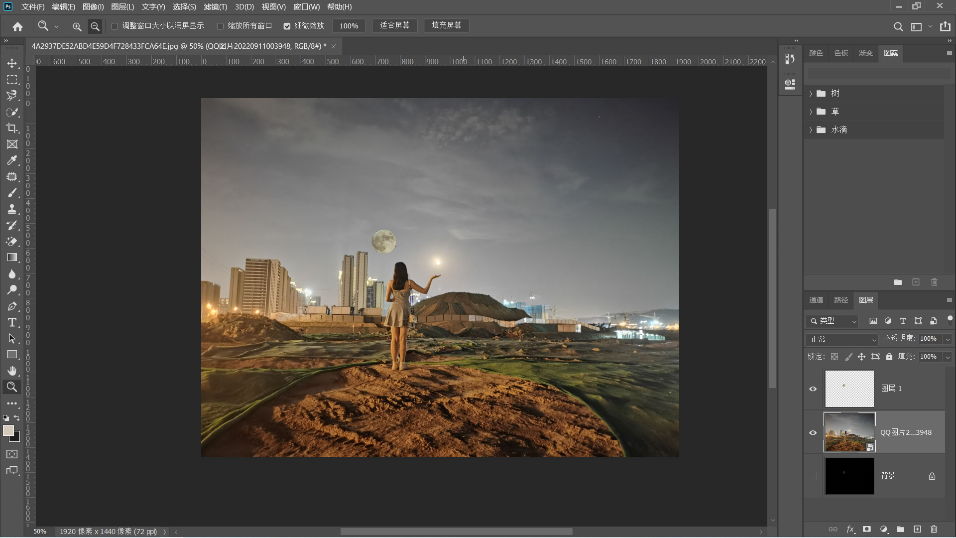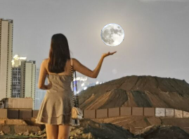 Photoshop,一张女友的照片,一张背景为纯色的月亮图(或者月亮与周围环境比较分明的图片)