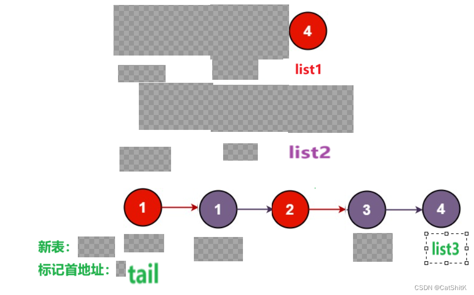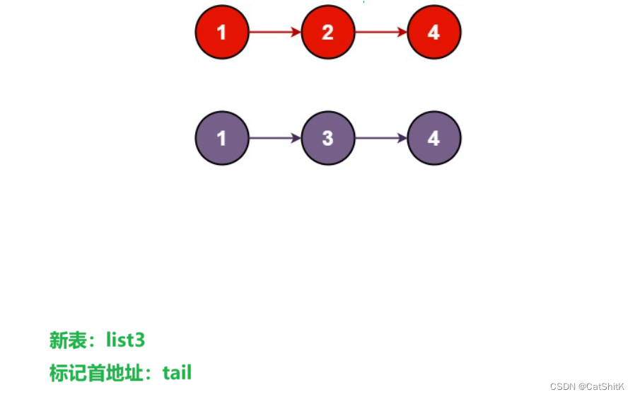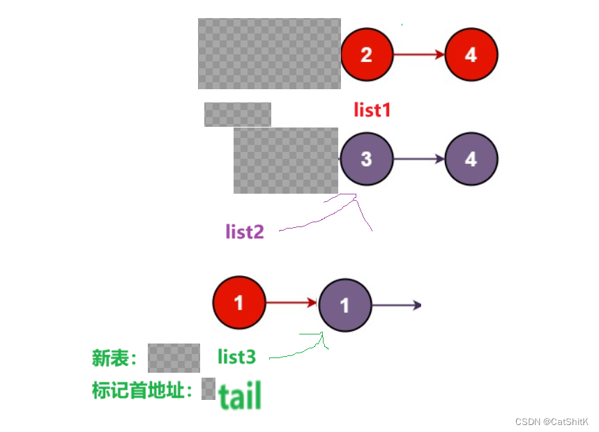 tail=list3=list2; //如果新链表没有头则把较小值的地址赋值