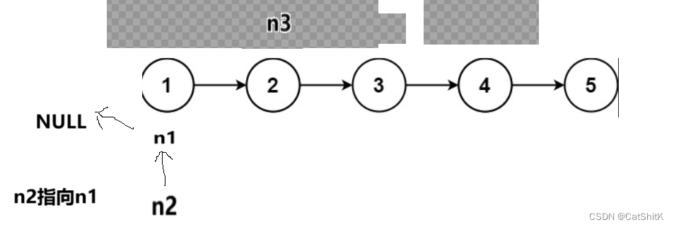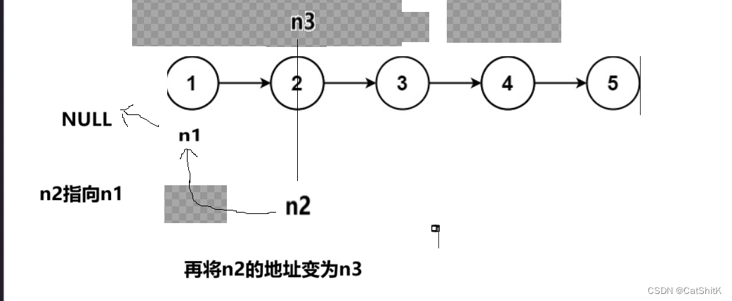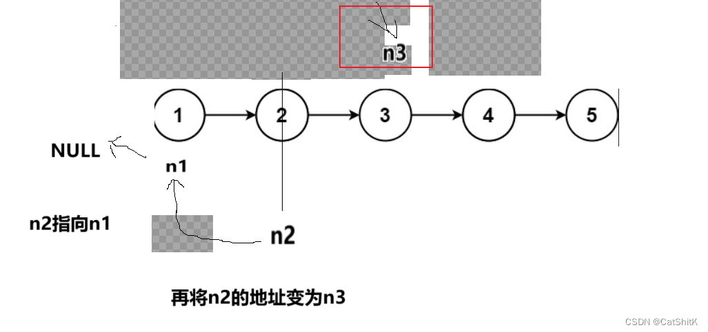 首先我们让n2的下一个结点指向n1,实现第二和第一个节点的相连,再让n2=n3改变n2的地址,再让n3向下一个节点移动