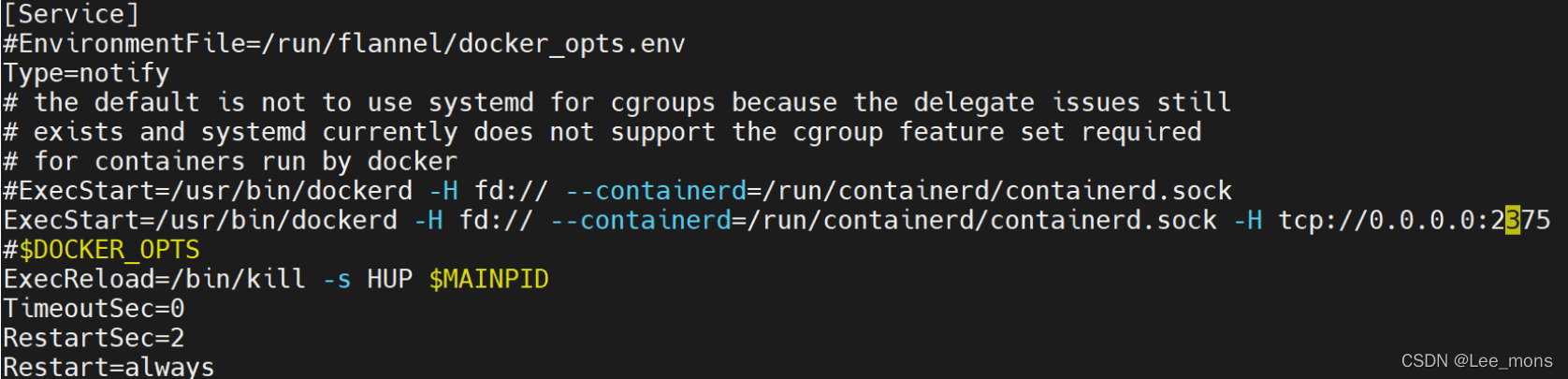 ExecStart=/usr/bin/dockerd -H fd:// --containerd=/run/containerd/containerd.sock -H tcp://0.0.0.0:2375 如图所示,把之前的语句注释掉