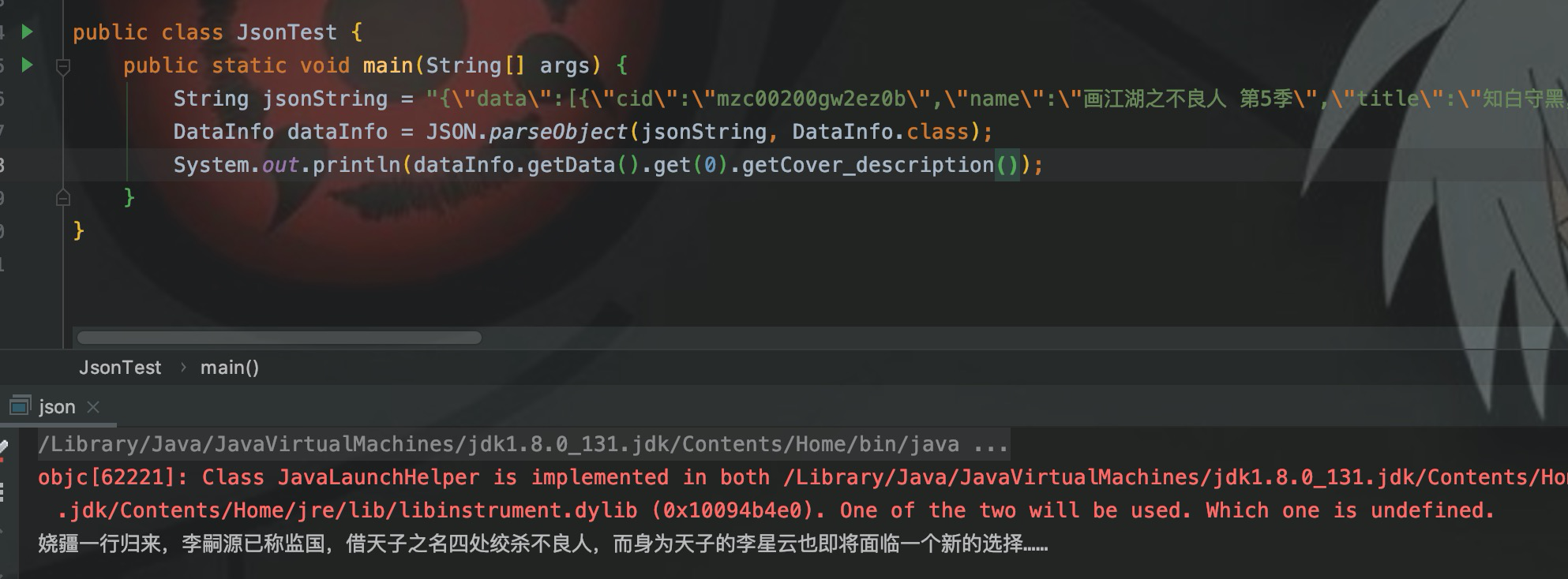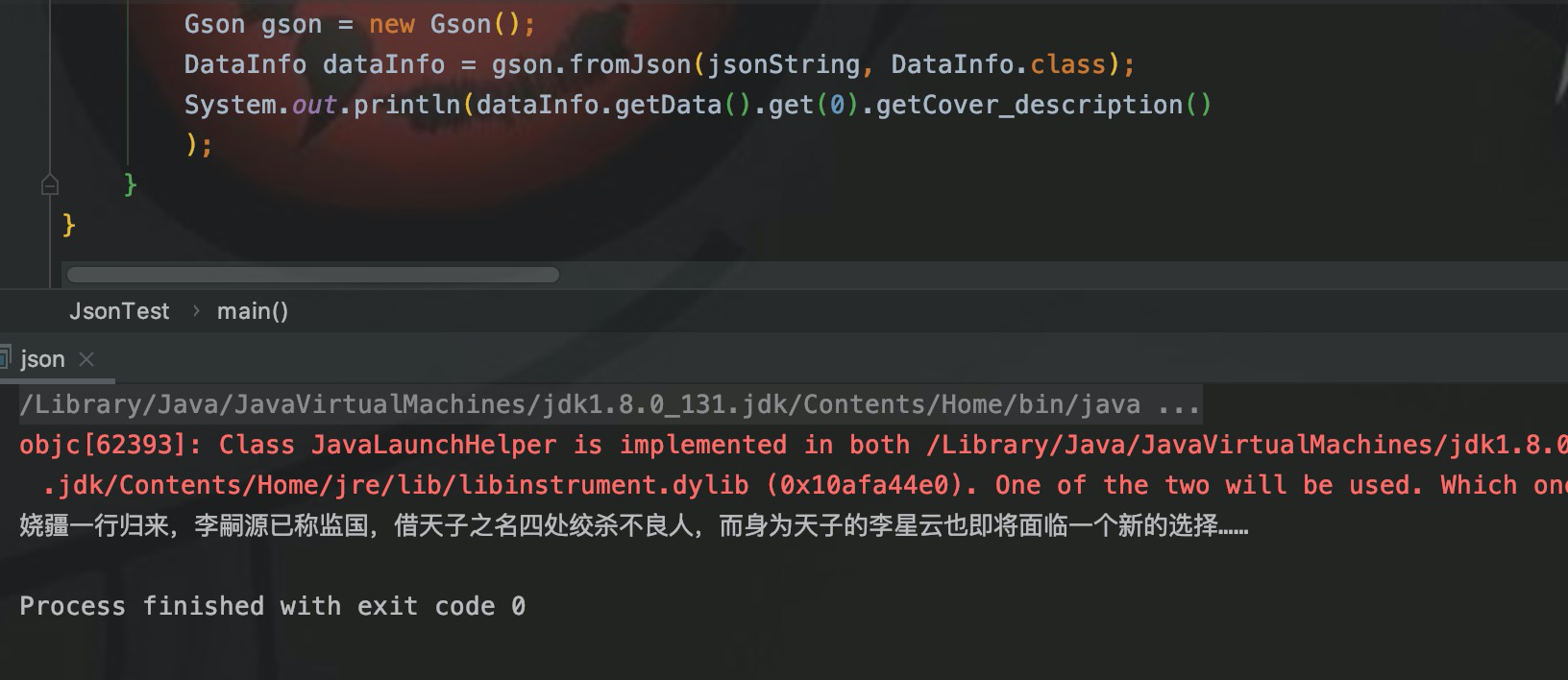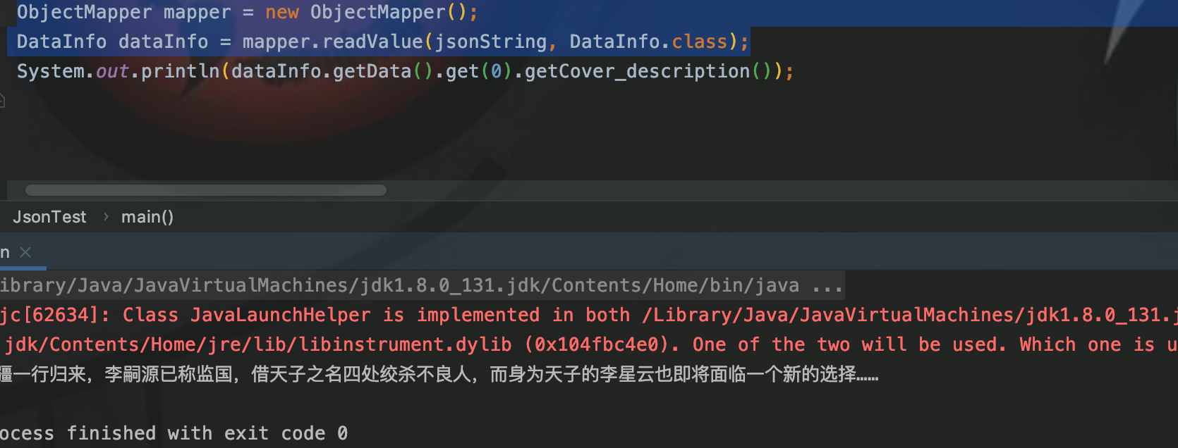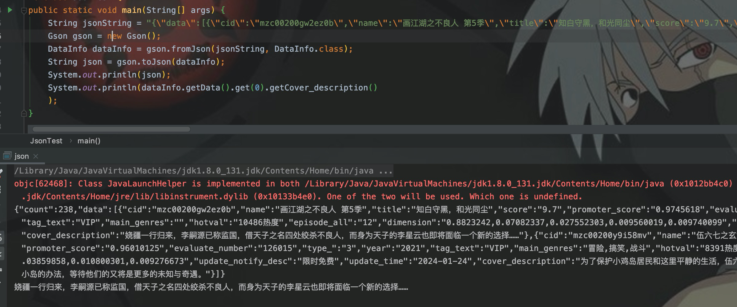 仅仅使用了一行代码,就将具有复杂类型的json字符串转换成java类,运行程序。