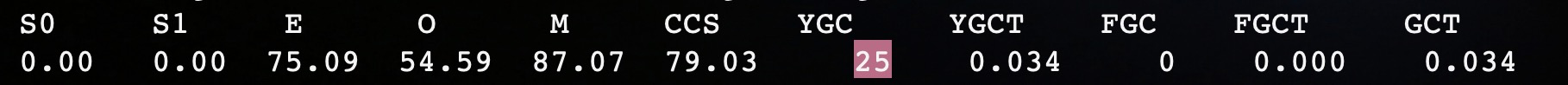 如图,共触发了25次YGC,因为字节数组b在创建之后,在后面没有被引用,所以当Eden满的时候,就会触发Young GC清理掉,从而不会进入S0、S1和老年代。