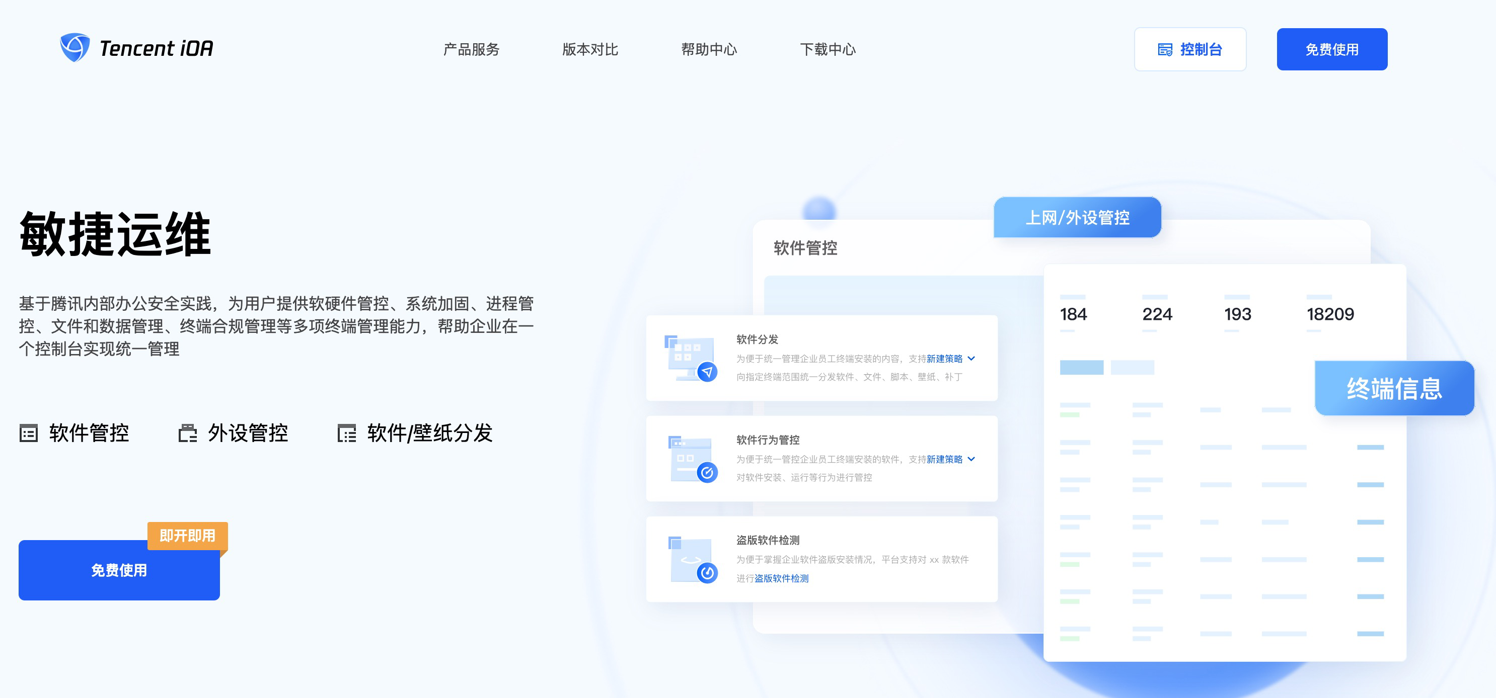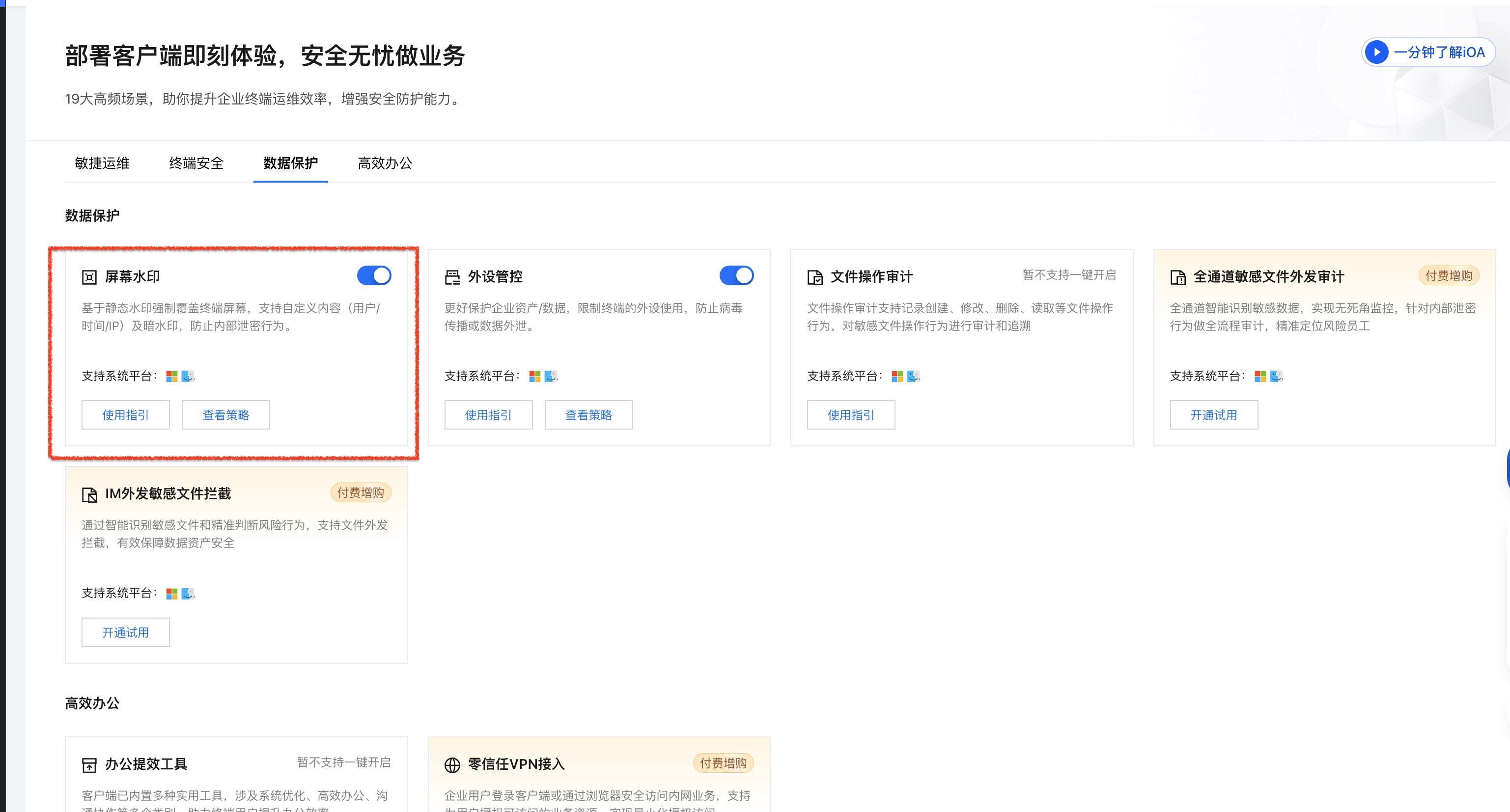 而 iOA 零信任安全管理系统,是腾讯自研自用的一体化办公平台商用版,可以提供零信任接入、终端安全、数据防泄密的十余种可灵活组合的功能模块,旨在帮企业创造安全、稳定、高效的办公环境。针对于上面的这些问题,iOA 交出了完美的答卷。
