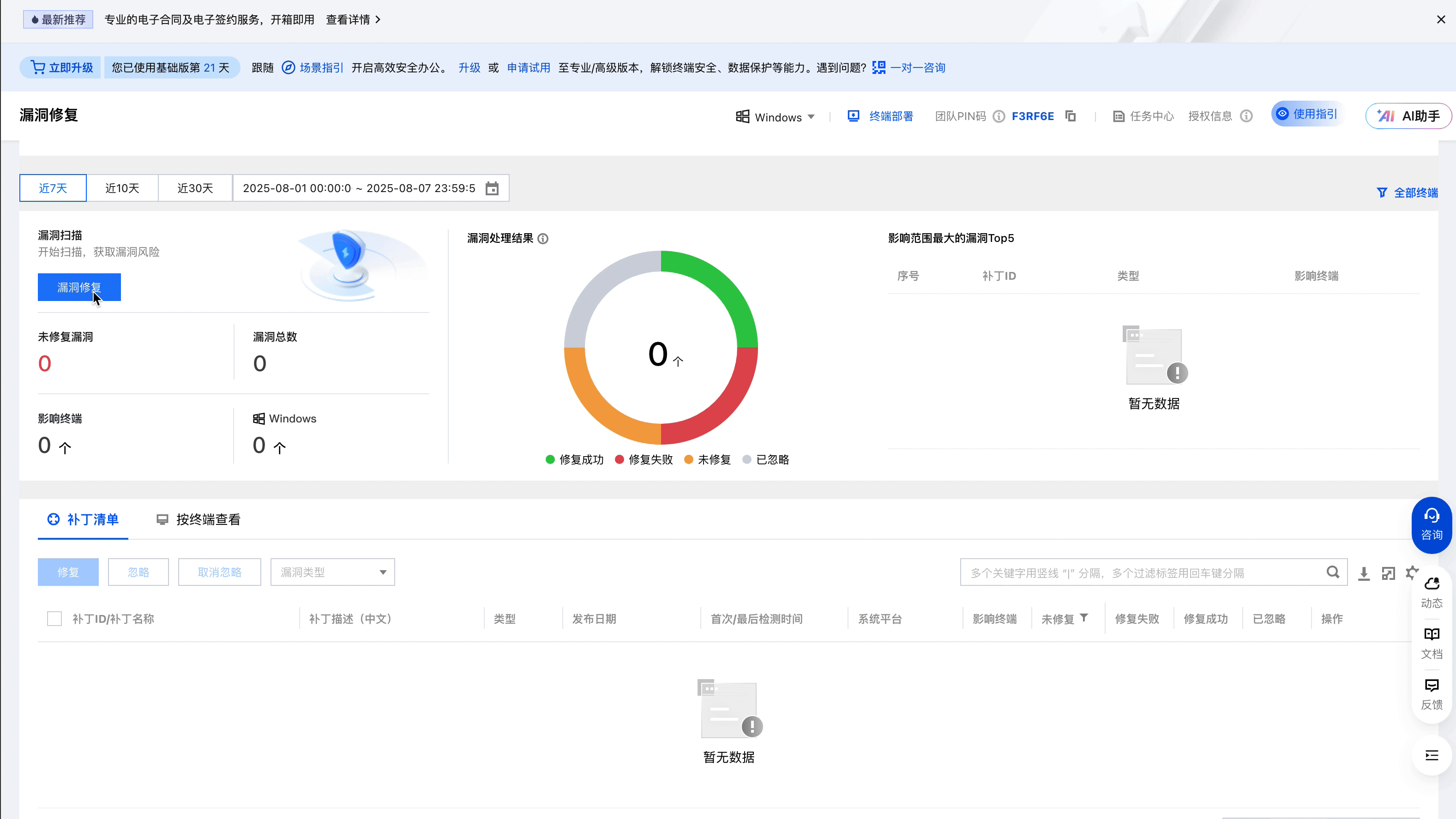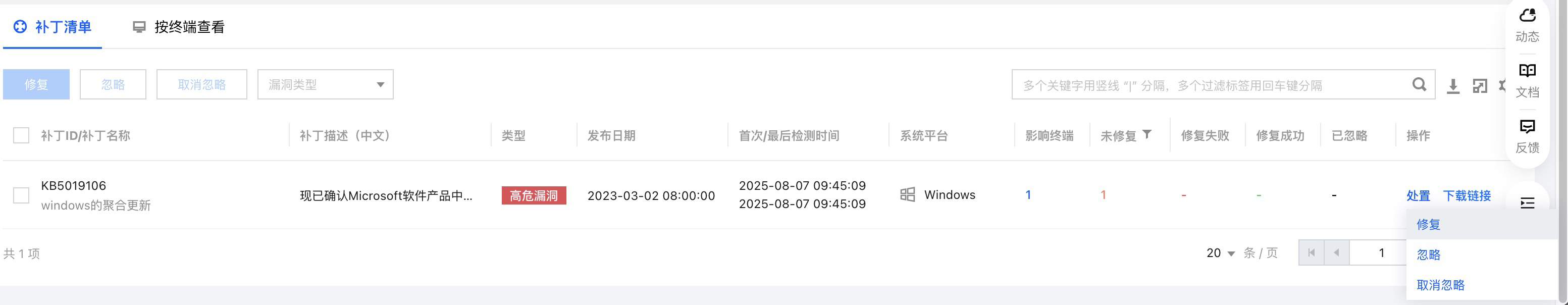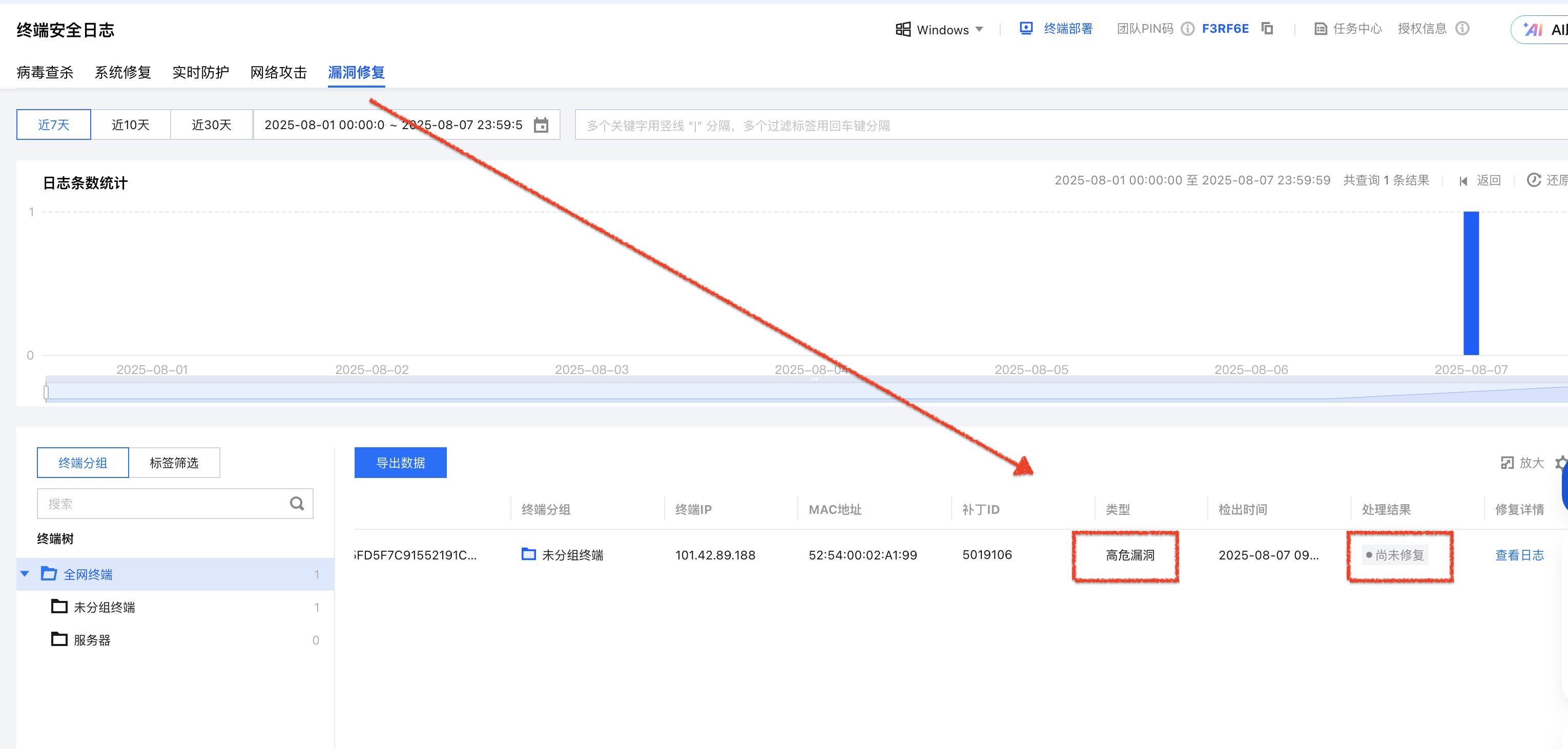 等待任务完成之后,再回到漏洞修复页面,就可以看到扫描出来的终端漏洞。