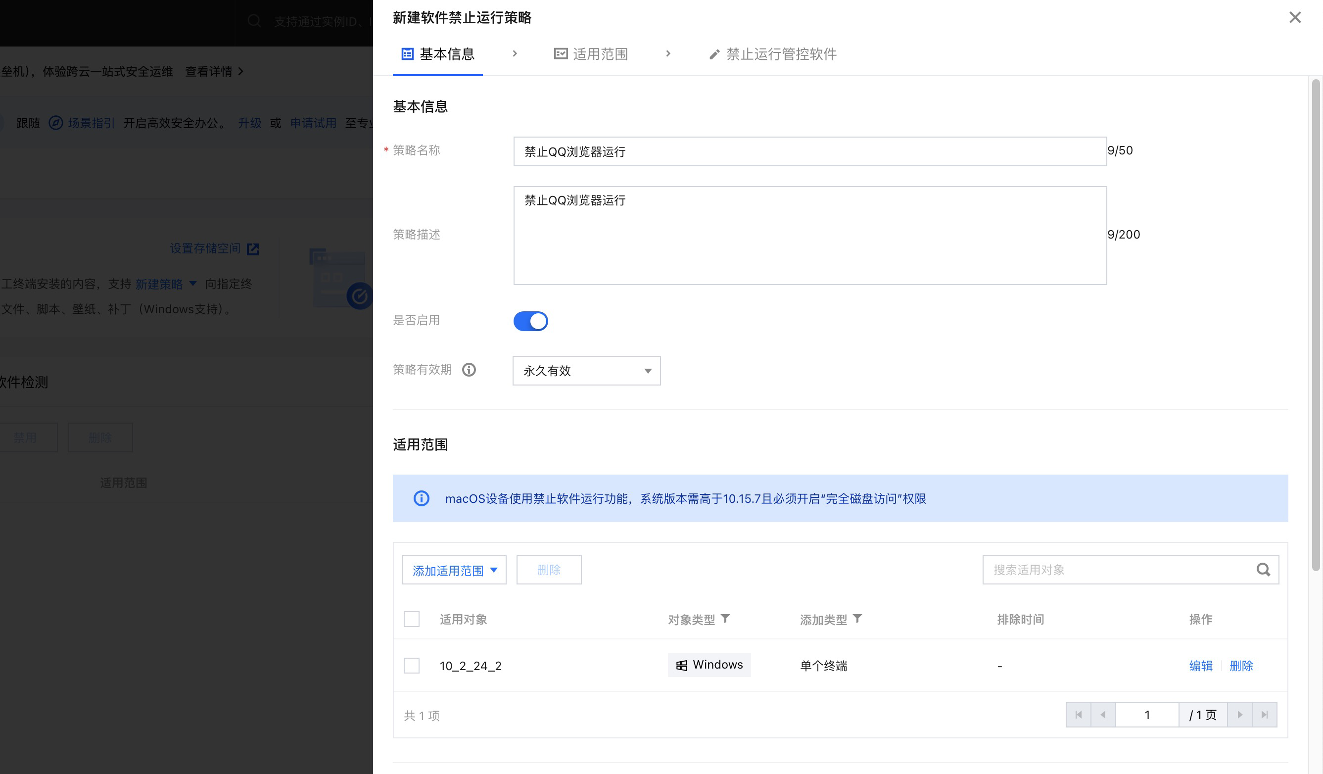 假如我们想禁止终端运行QQ浏览器,我们在软件行为管控下,新建一个 禁止运行 策略。