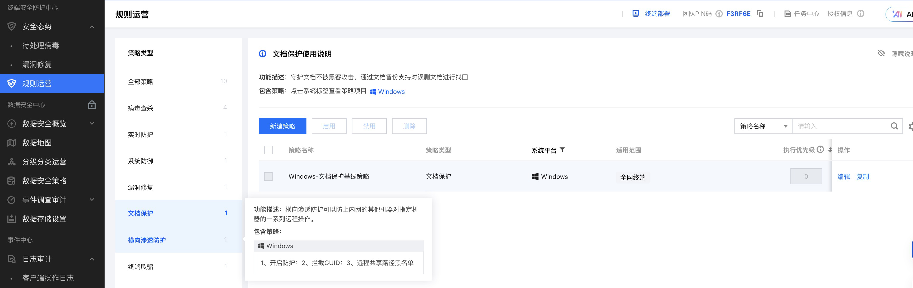 除了上面手动开启安全防护之外,在 规则运营 中 iOA 也内置了很多安全策略,例如病毒查杀、实时防护、漏洞修复、文档保护等。这些策略都会定时触发保护用户终端。