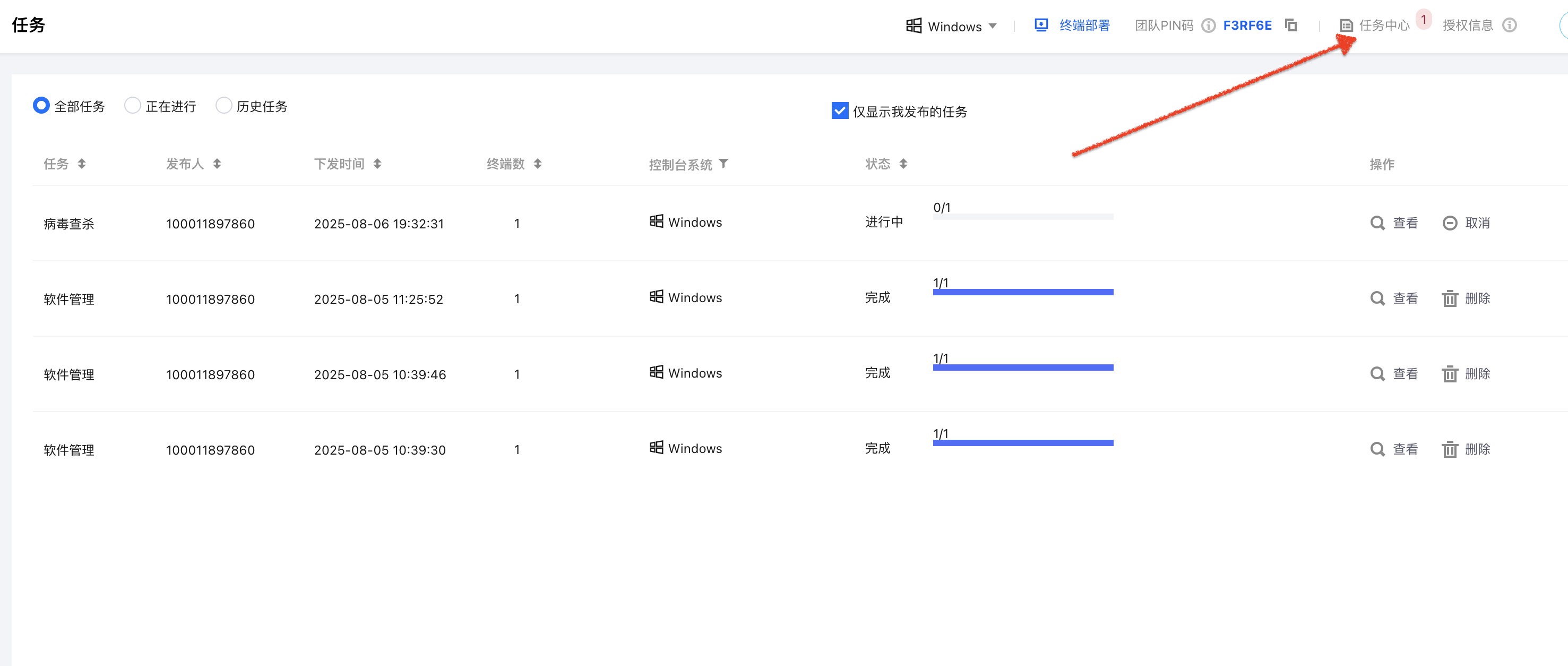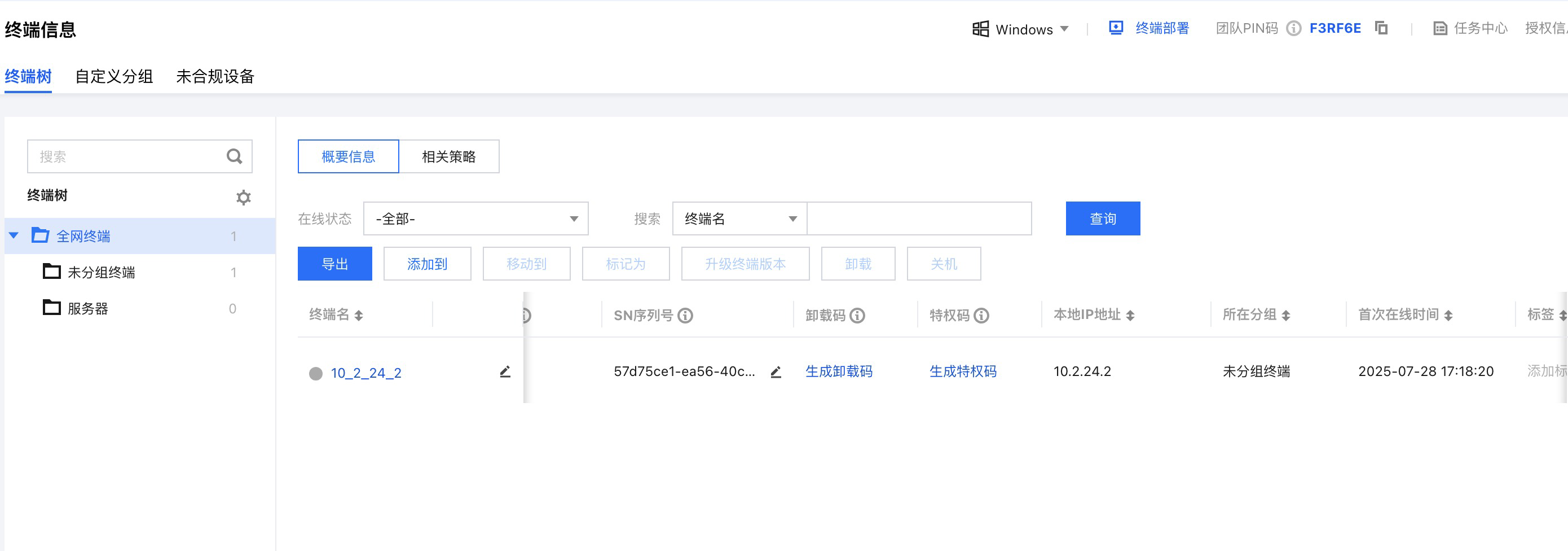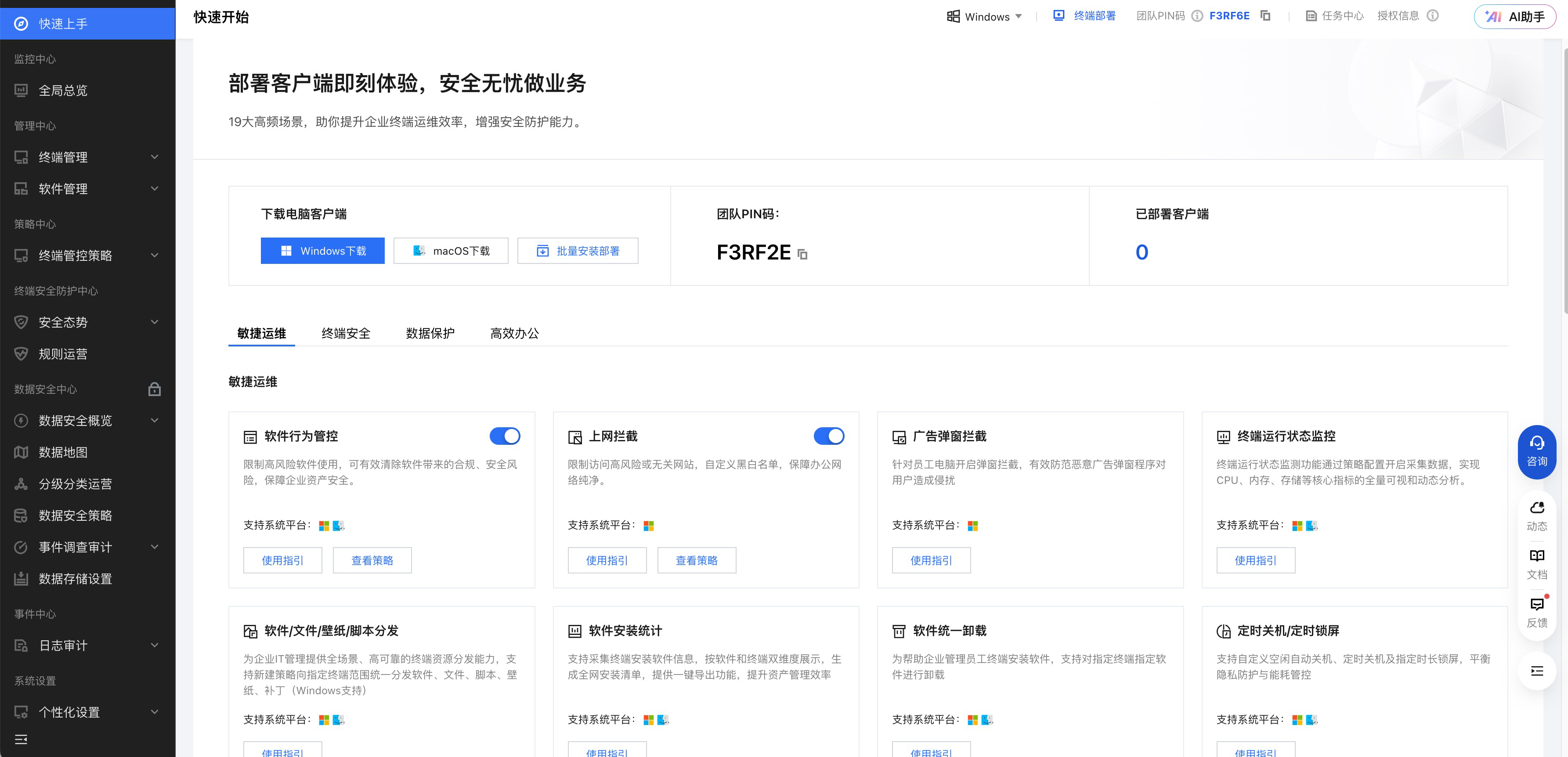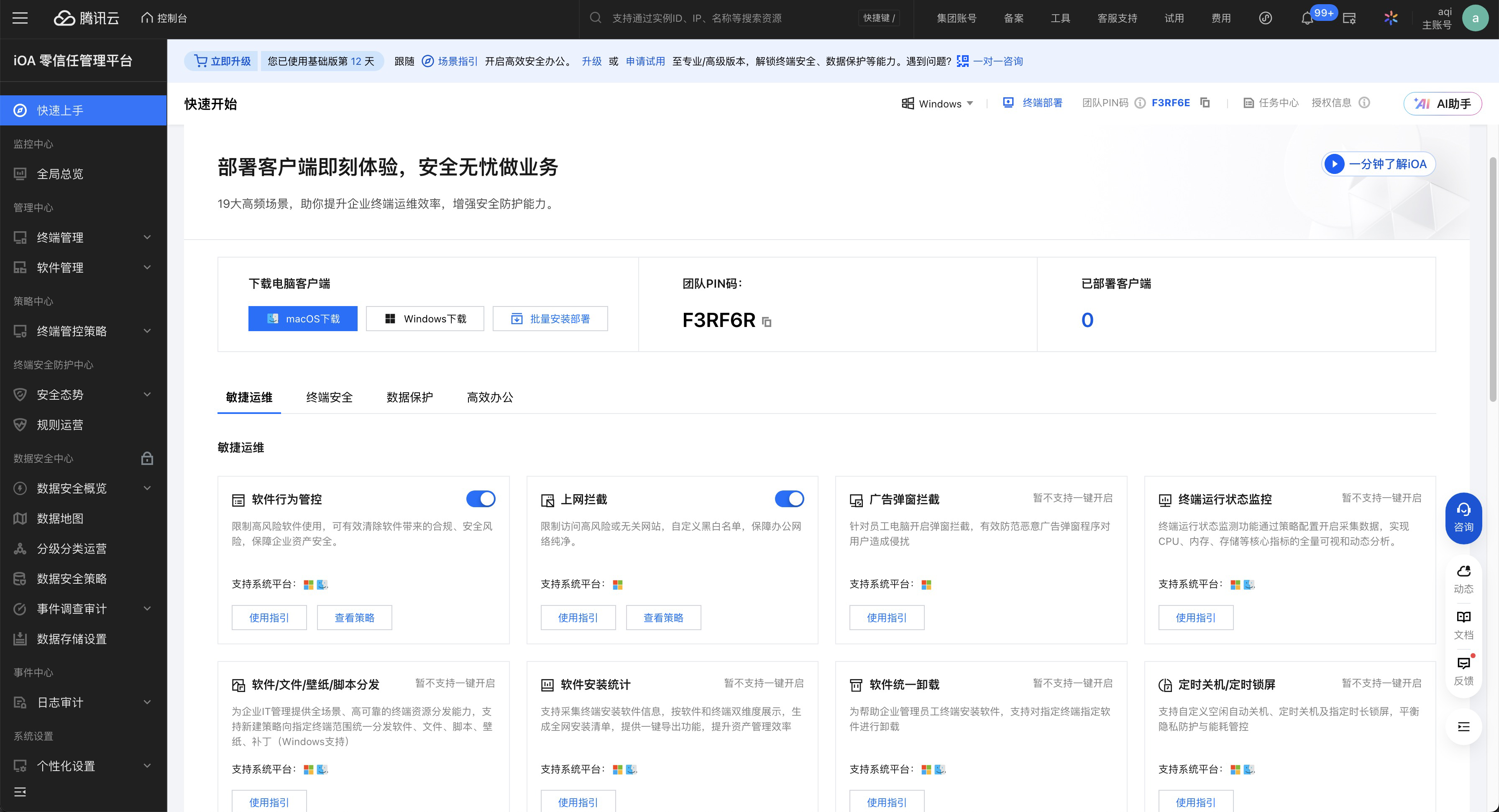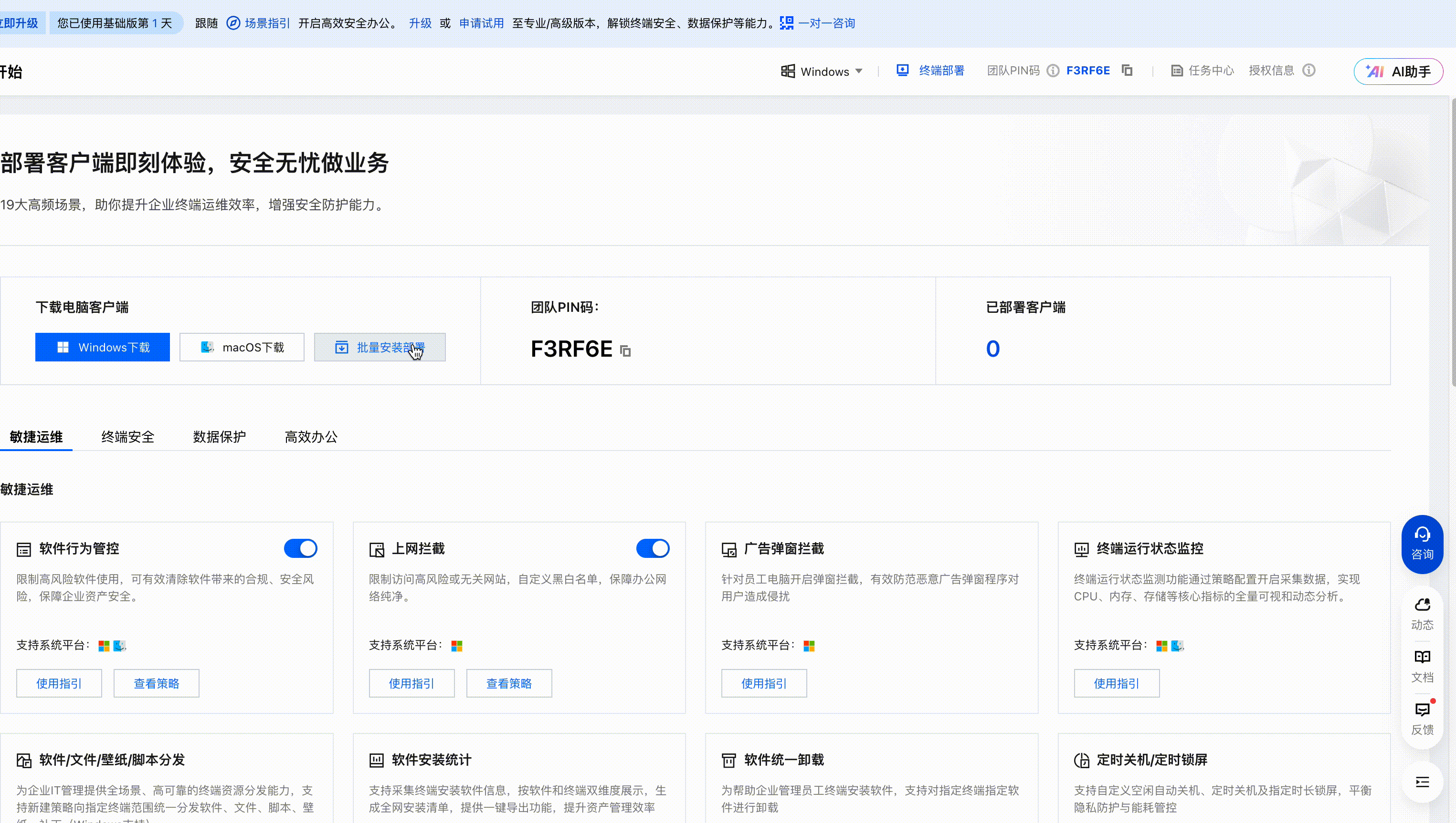 这台通过我的 PIN 码安装了 iOA 的终端就加入了我的团队,在 iOA 控制台就可以看到 部署客户端 已经从 0 变成 1 了。