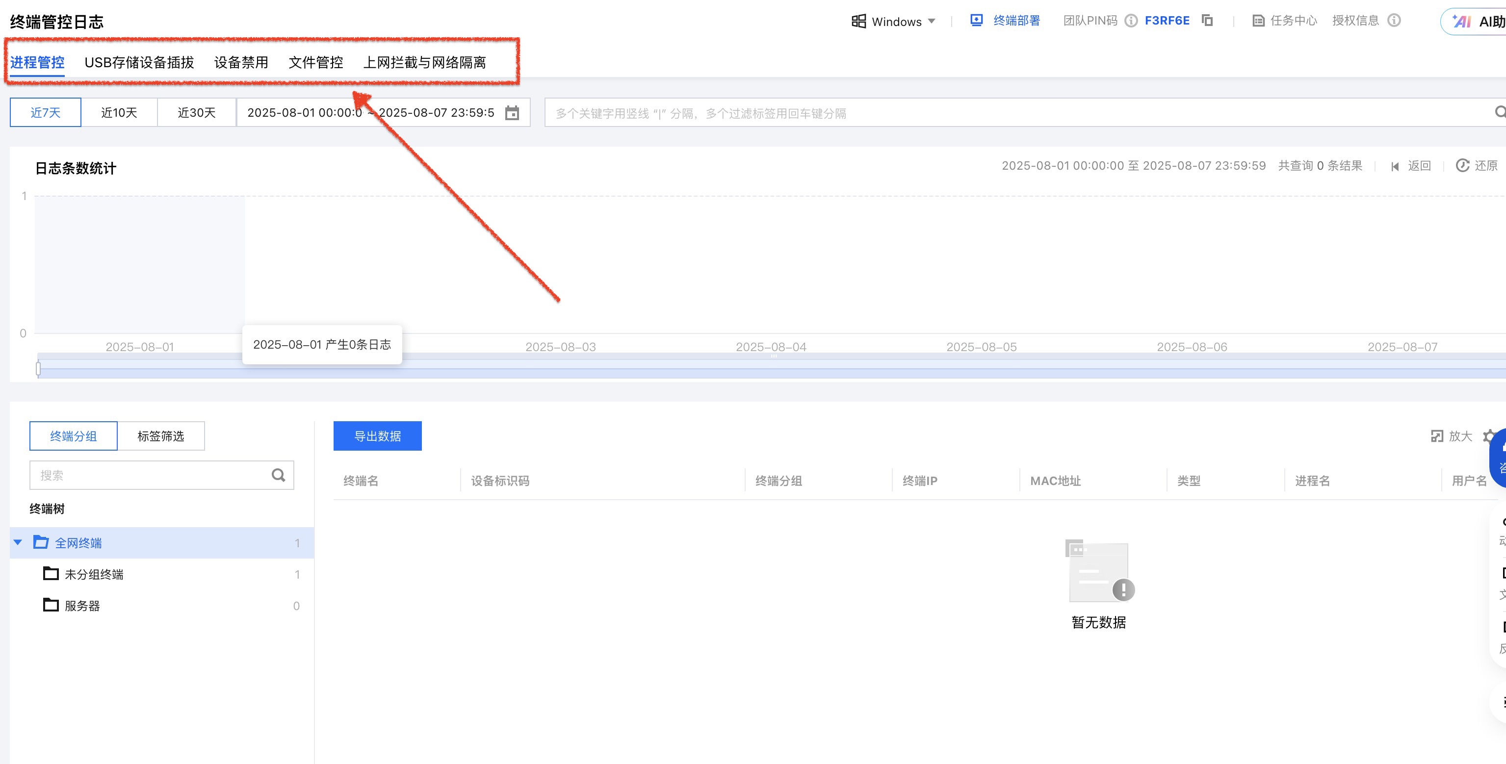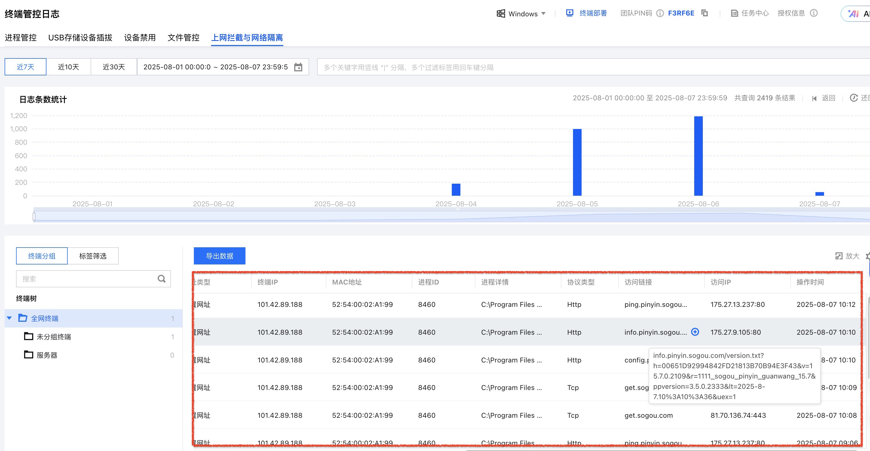 终端管控日志就是查看包含进程管控、USB存储设备插拔管控、设备禁用、文件管控以及上网拦截与网络隔离。很多生产环境中会检测外部存储介质和上网信息,以此来禁止这些行为。在 iOA 终端管控日志中可以看到这些信息。