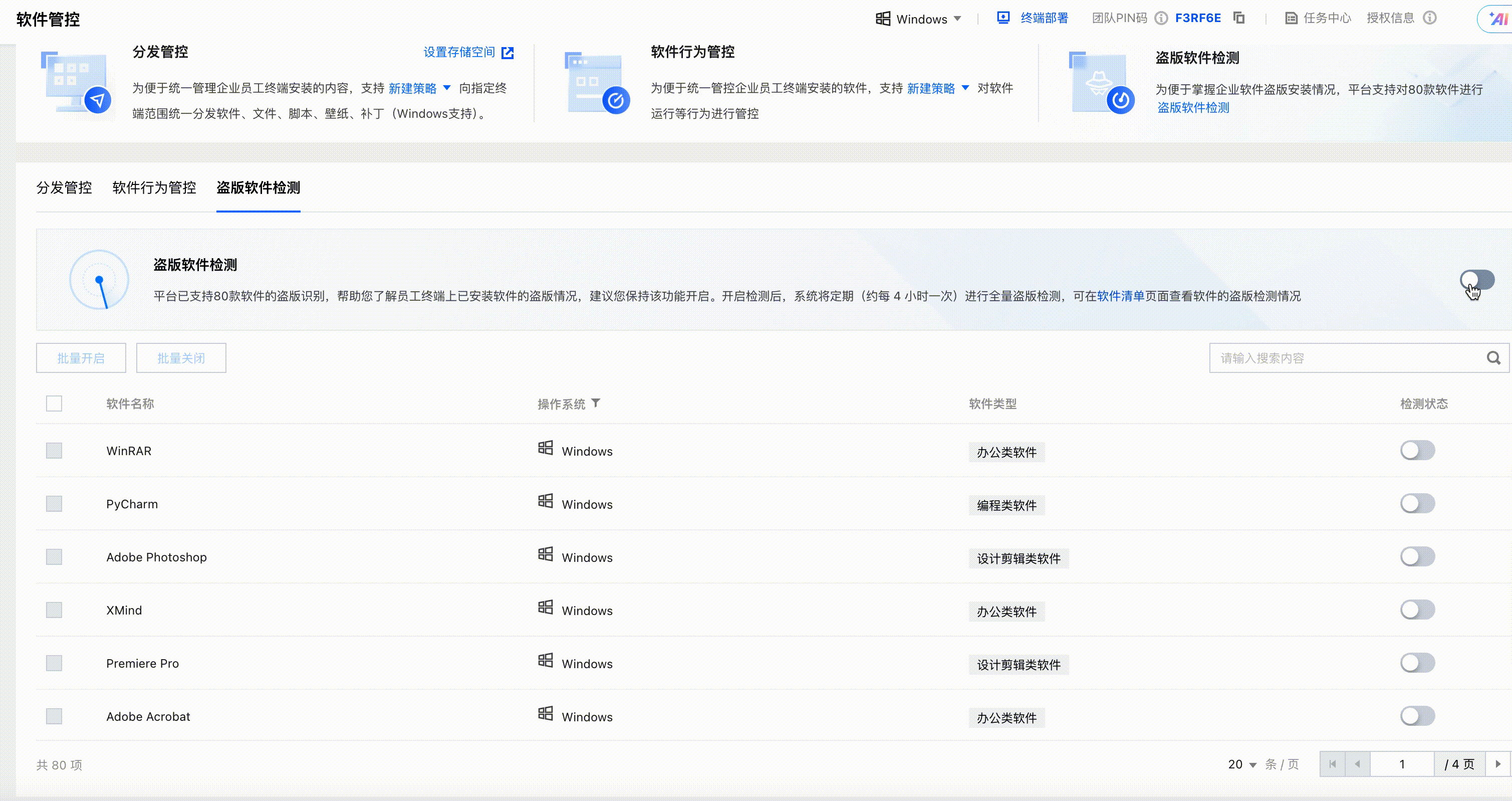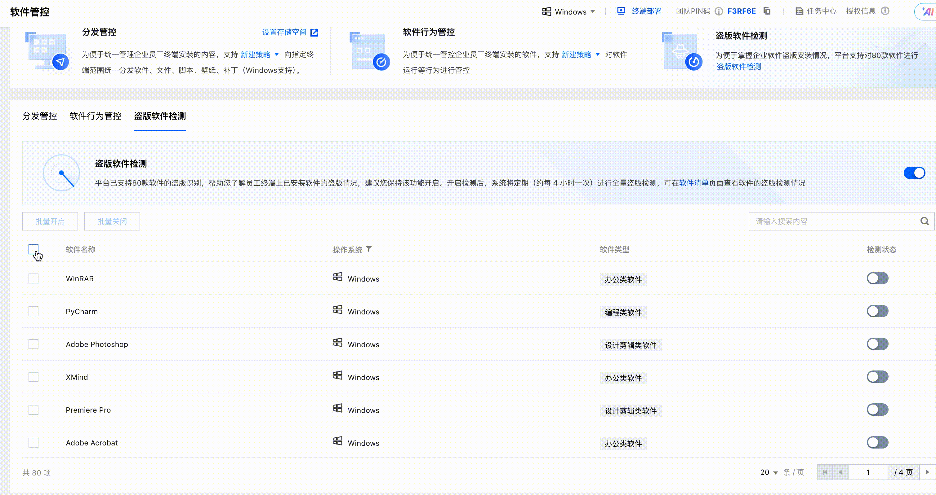 在软件管控页面,选择盗版软件检测,先开启盗版软件检测。