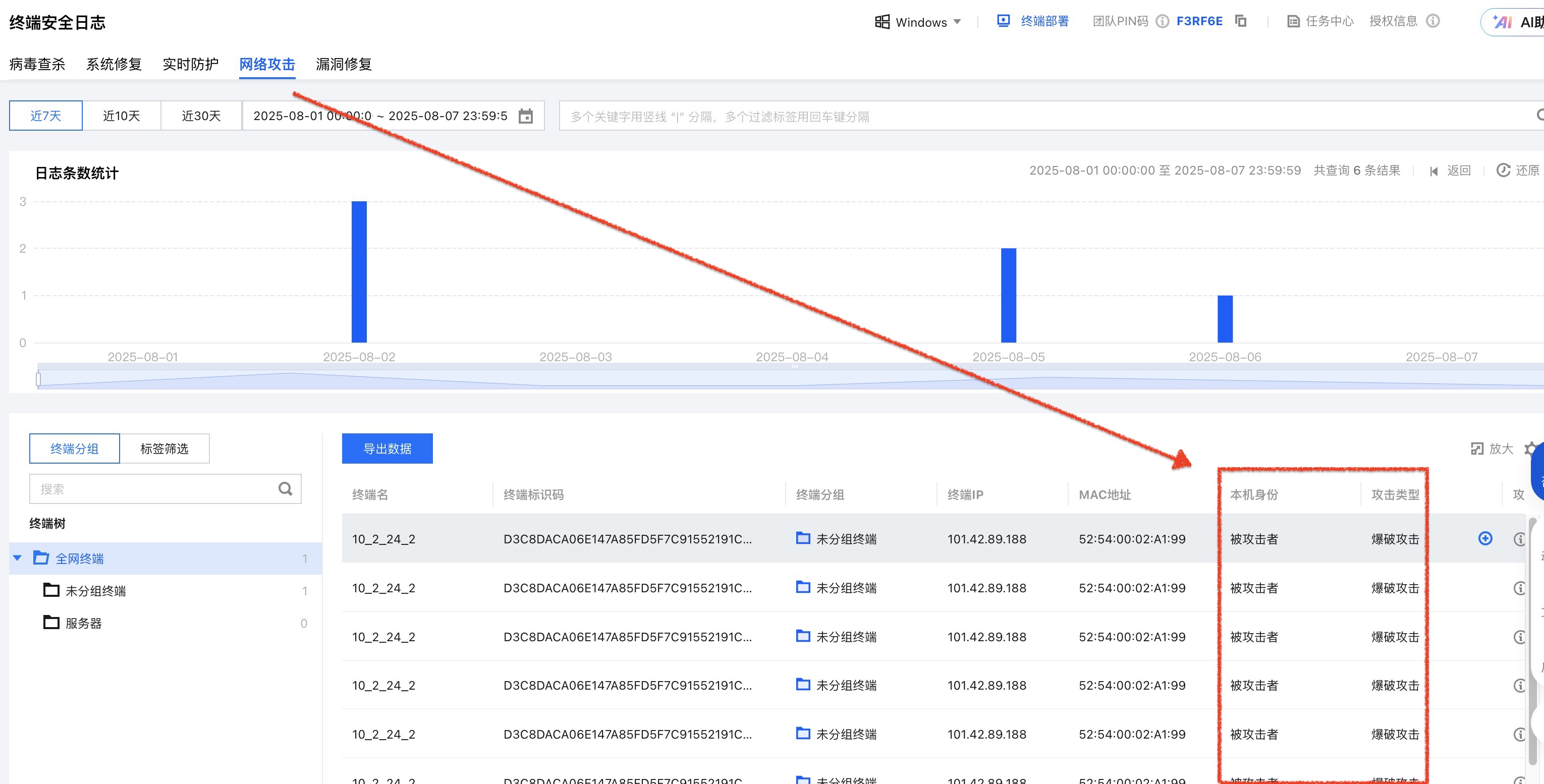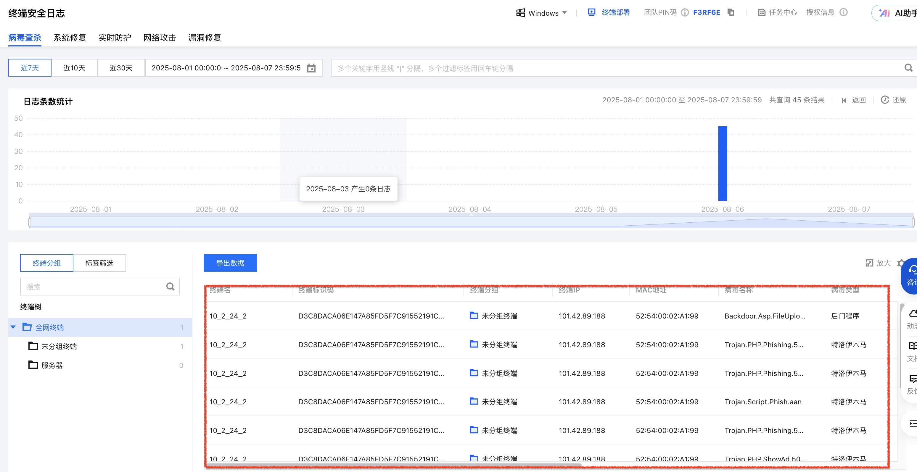 终端安全日志就是记录用户终端潜在风险的日志,包括病毒查杀、系统修复、实时防护、网络攻击以及漏洞修复的日志。
