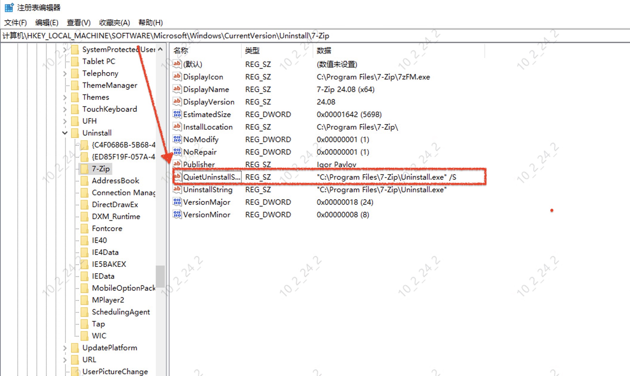 如下图,7-zip 这个软件就存在 QuietUninstallString 字段,表示支持静默卸载。
