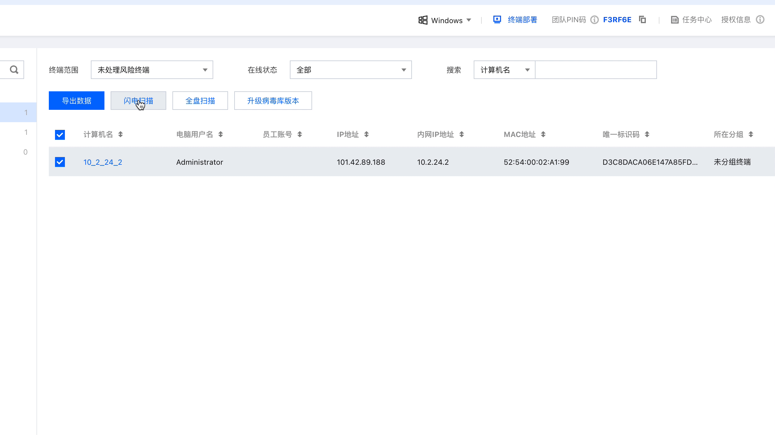 选中风险终端,点击 闪电查杀,然后就会弹出扫描结果处理。