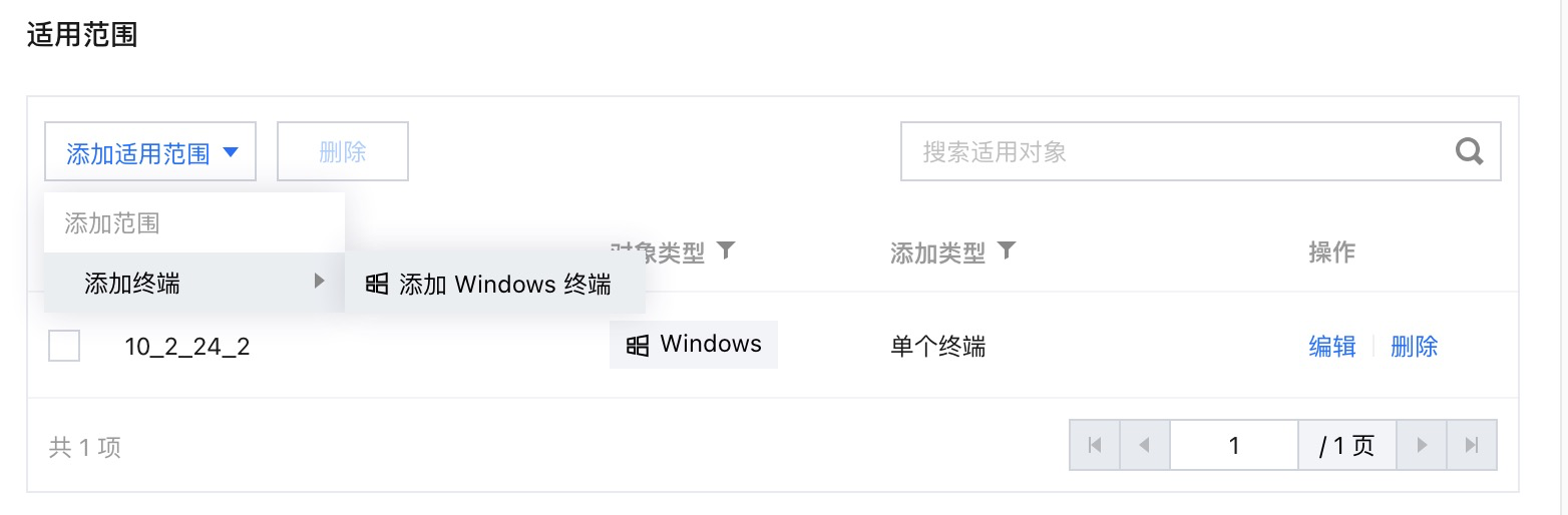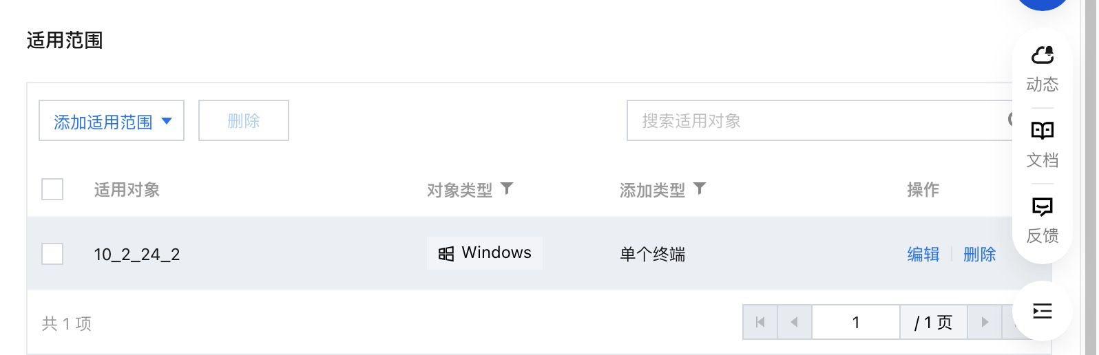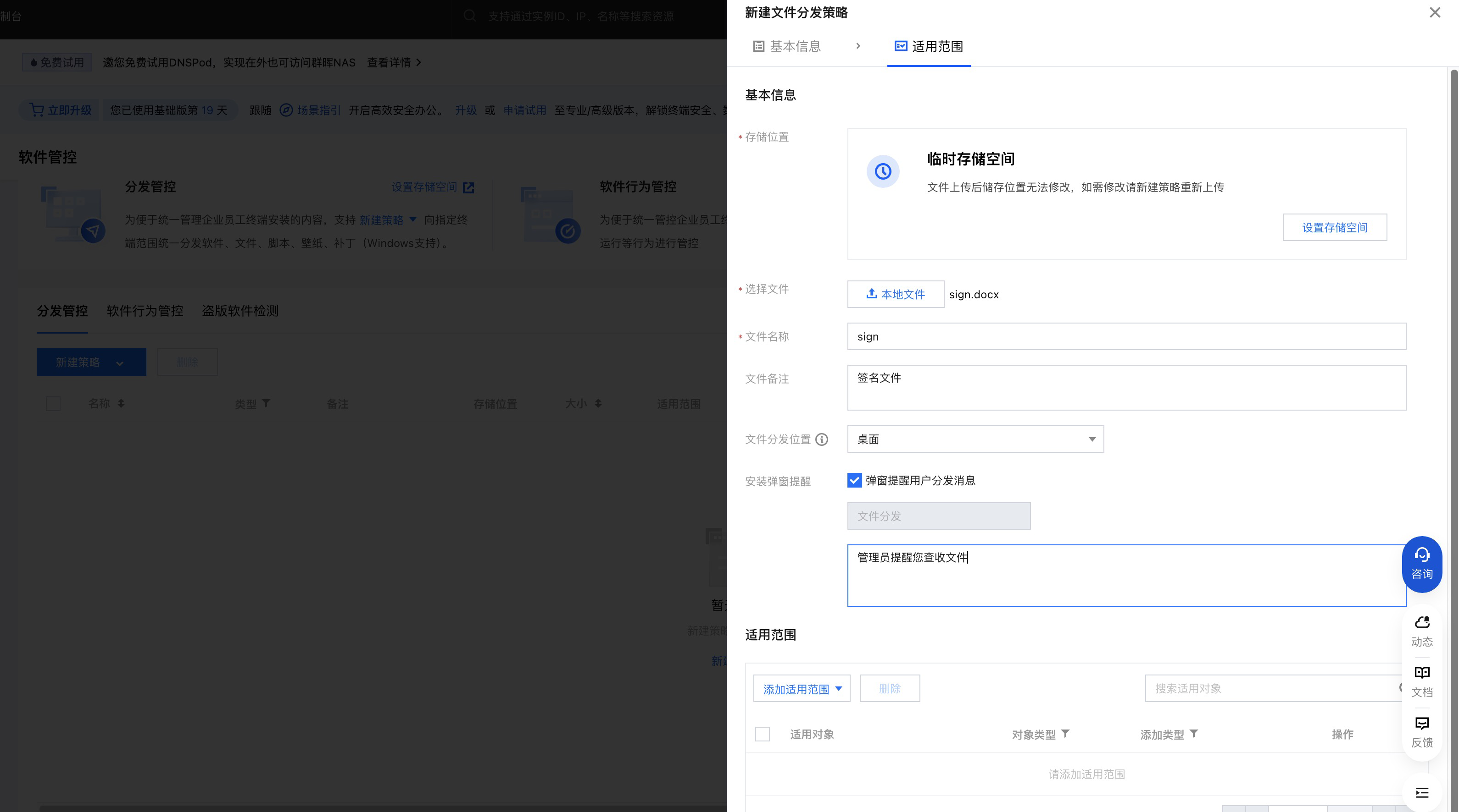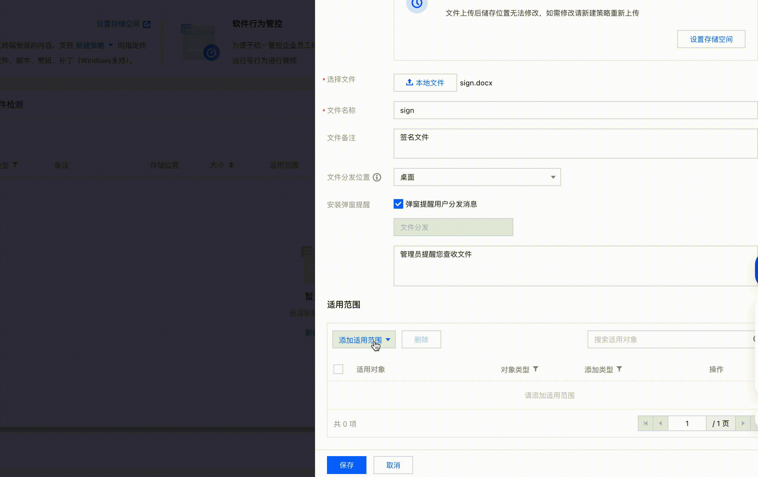 在完成基本的配置后,就要选择 适用范围,换句话说就是要选择把文件发给谁,点击 添加适用范围 添加终端,然后勾选终端。
