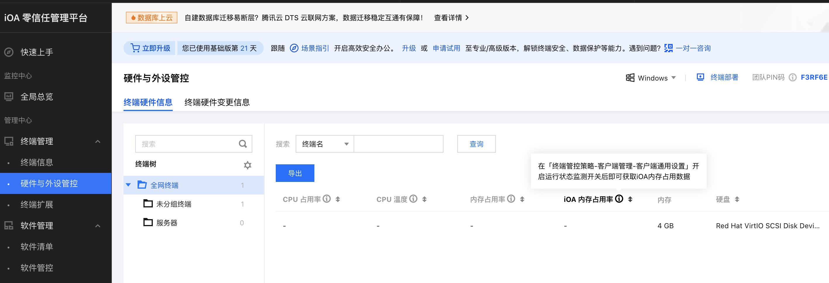 在用户终端完成 iOA 的安装之后,我们就可以体验 终端管理 的功能了。主要有终端信息、硬件与外设管控以及终端扩展。