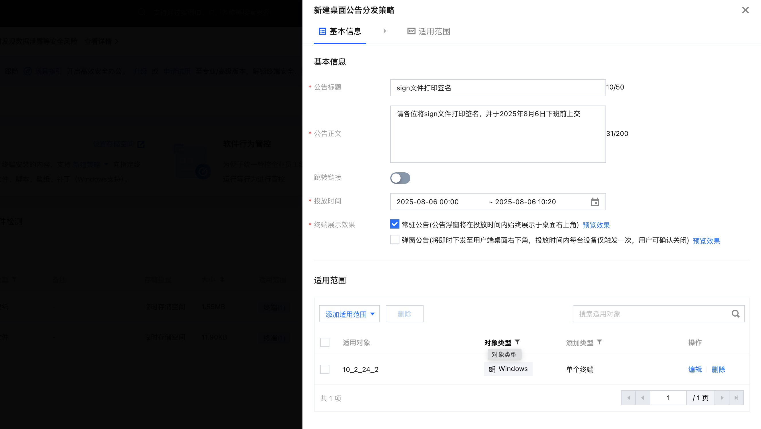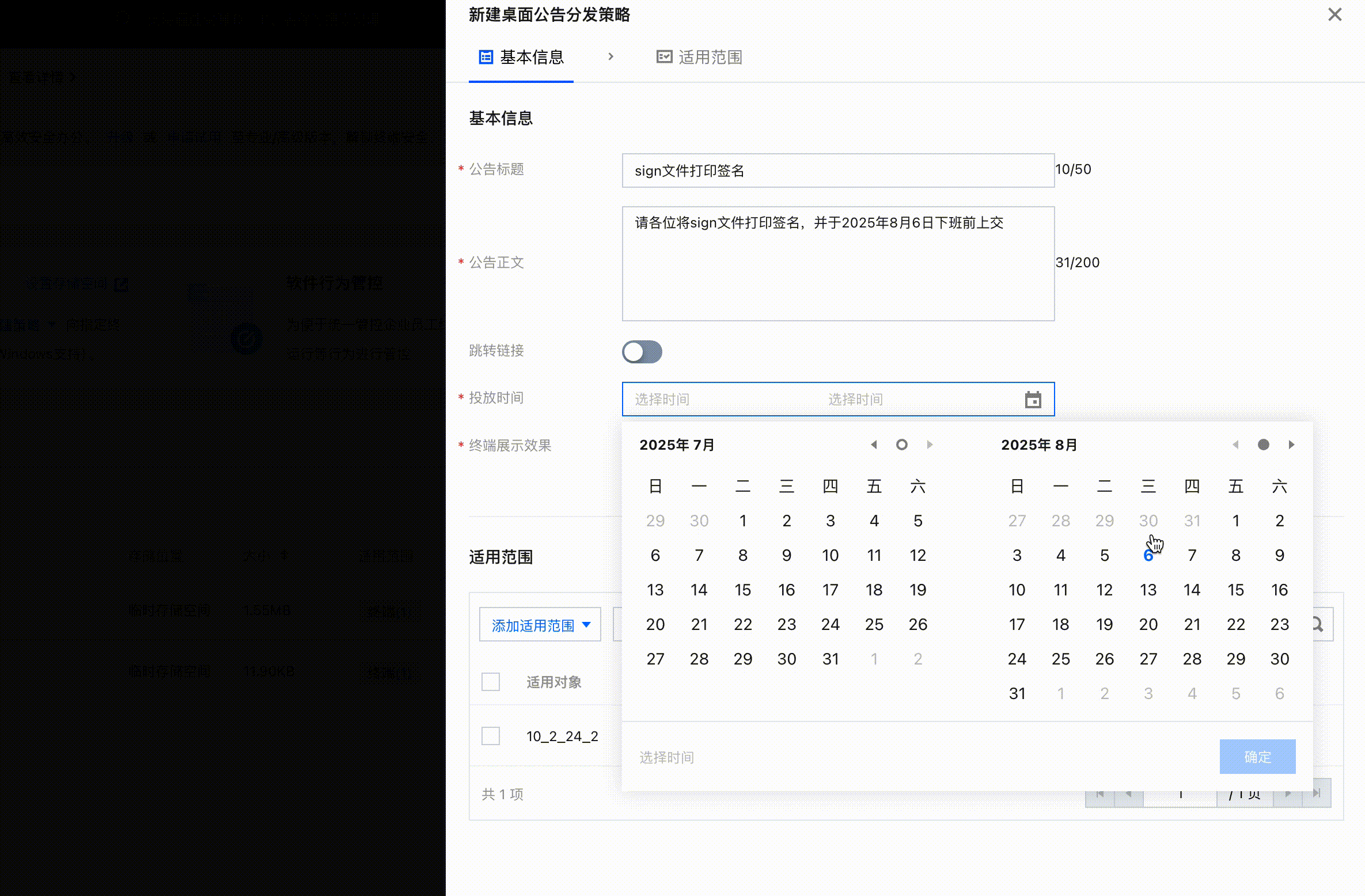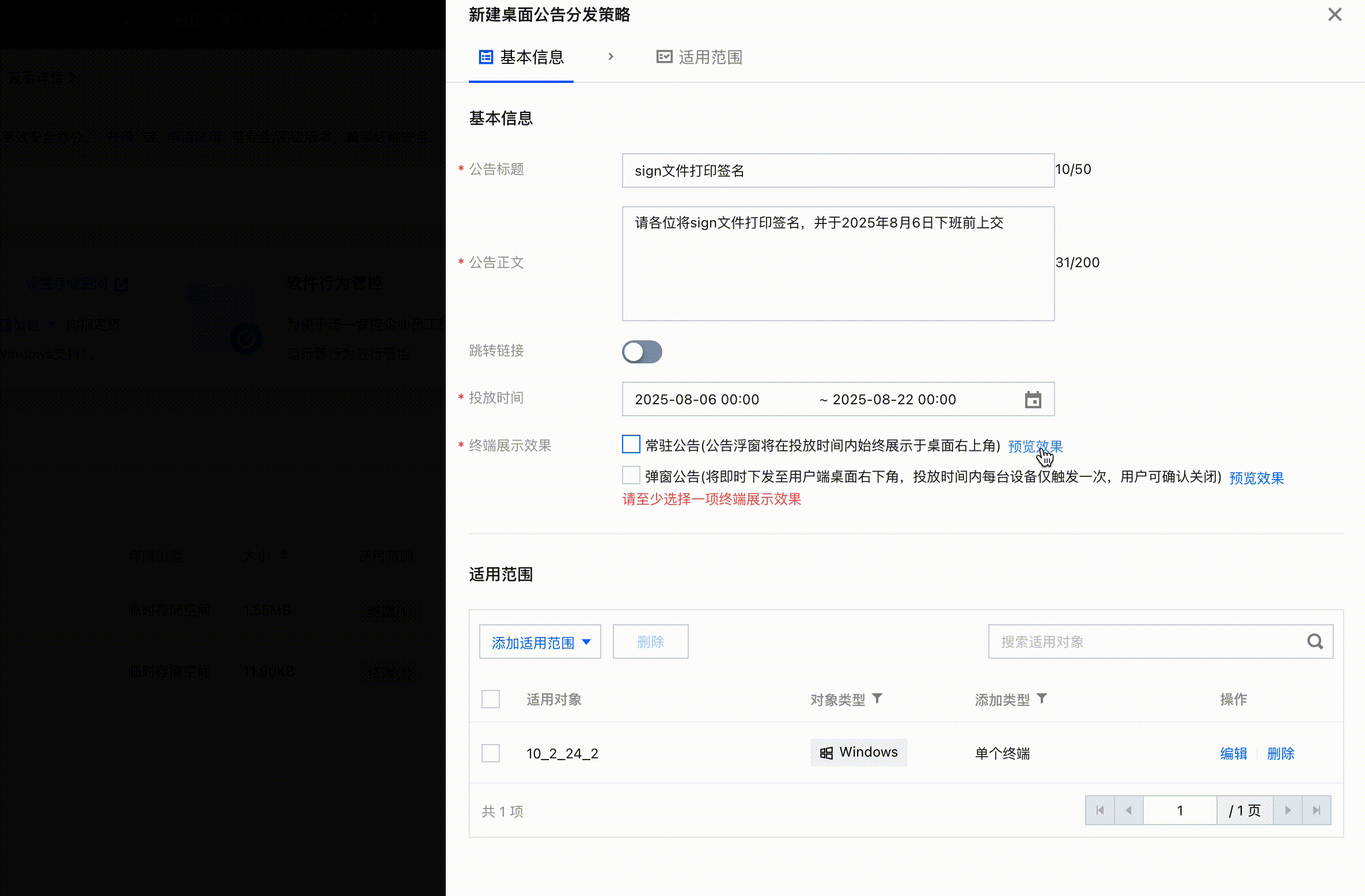 同样在新建桌面公告分发策略界面,我们填写基本的公告标题和正文信息之后,可以设置投放的时间和公告的展示效果。