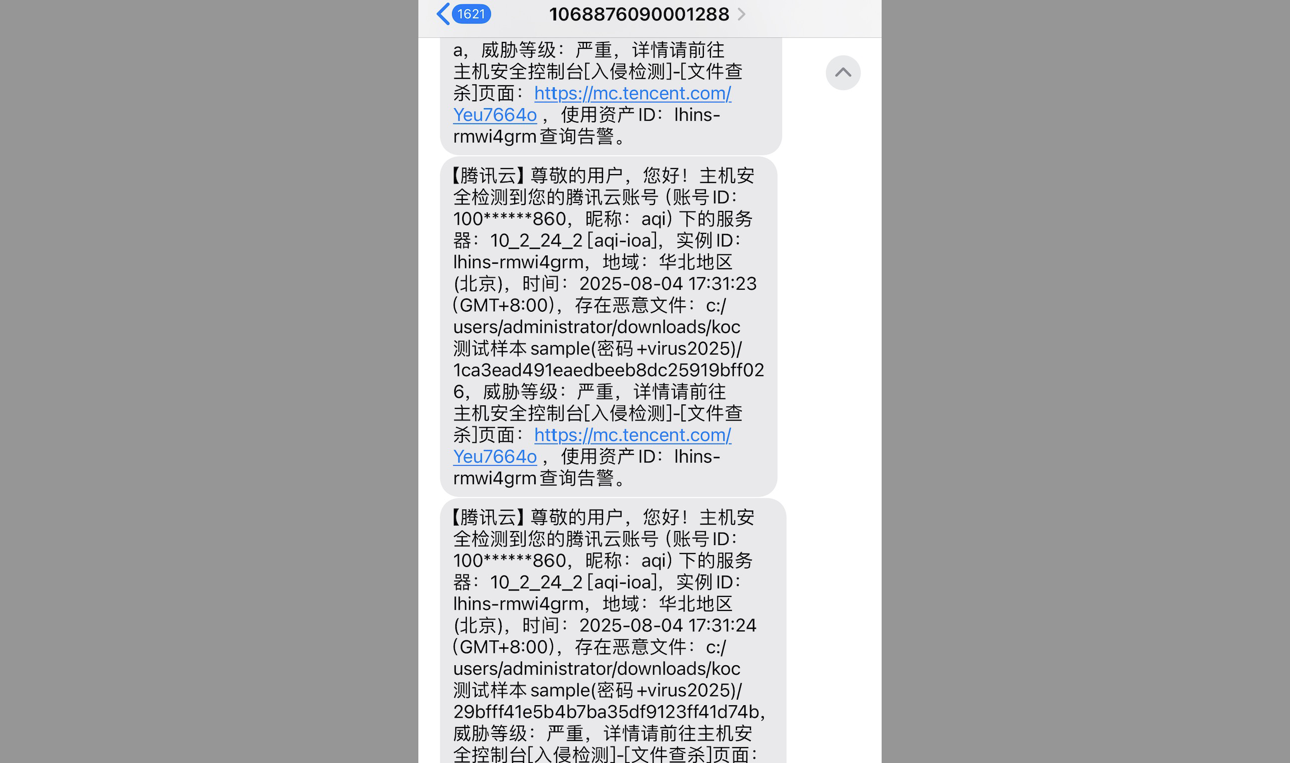 结果下载解压完成之后,就收到了腾讯云的短信提醒: