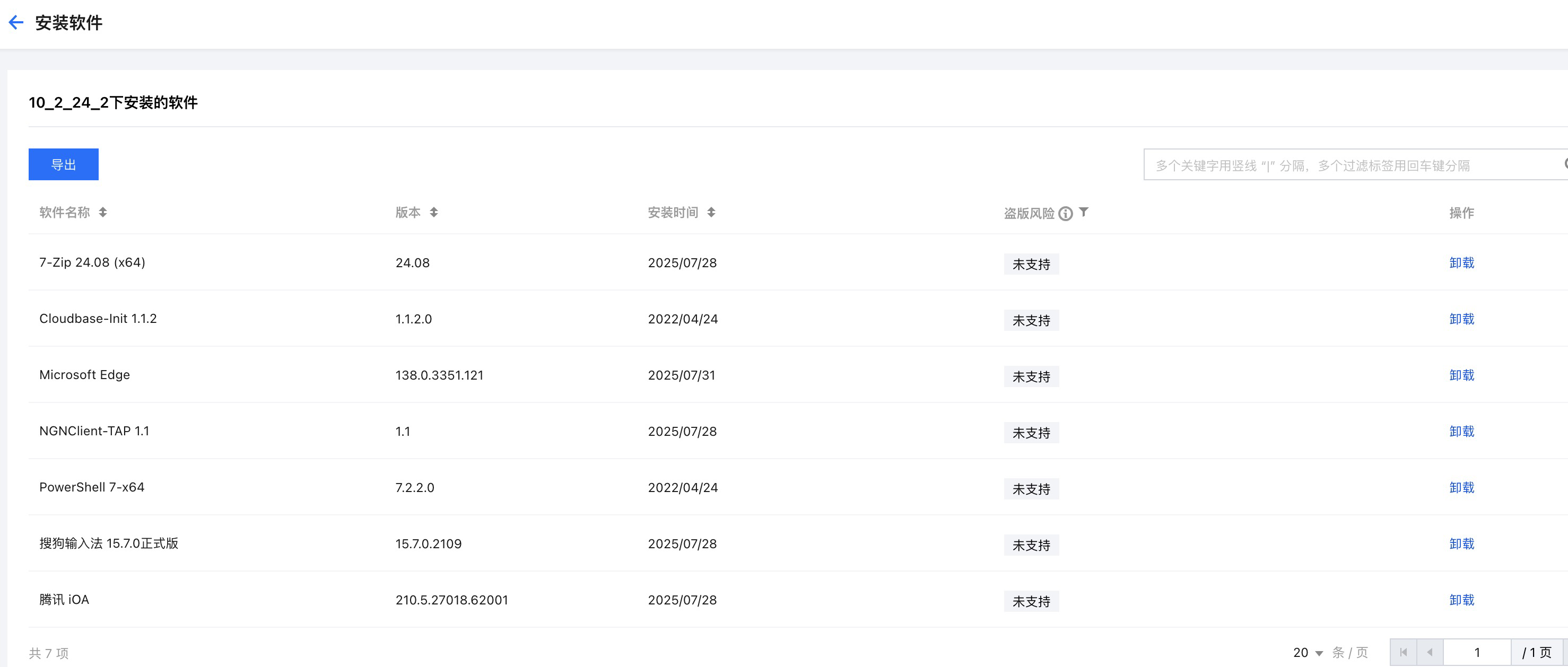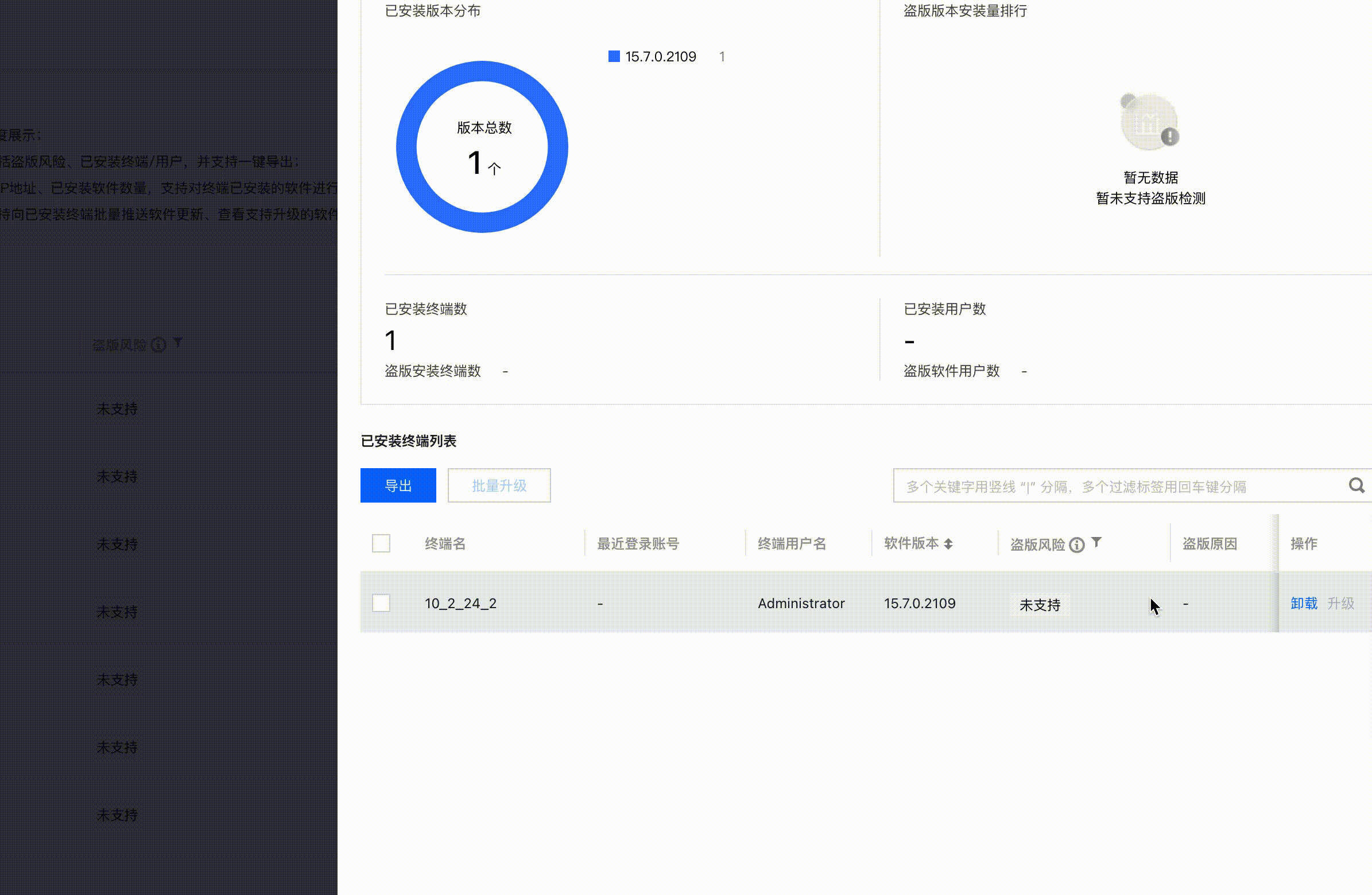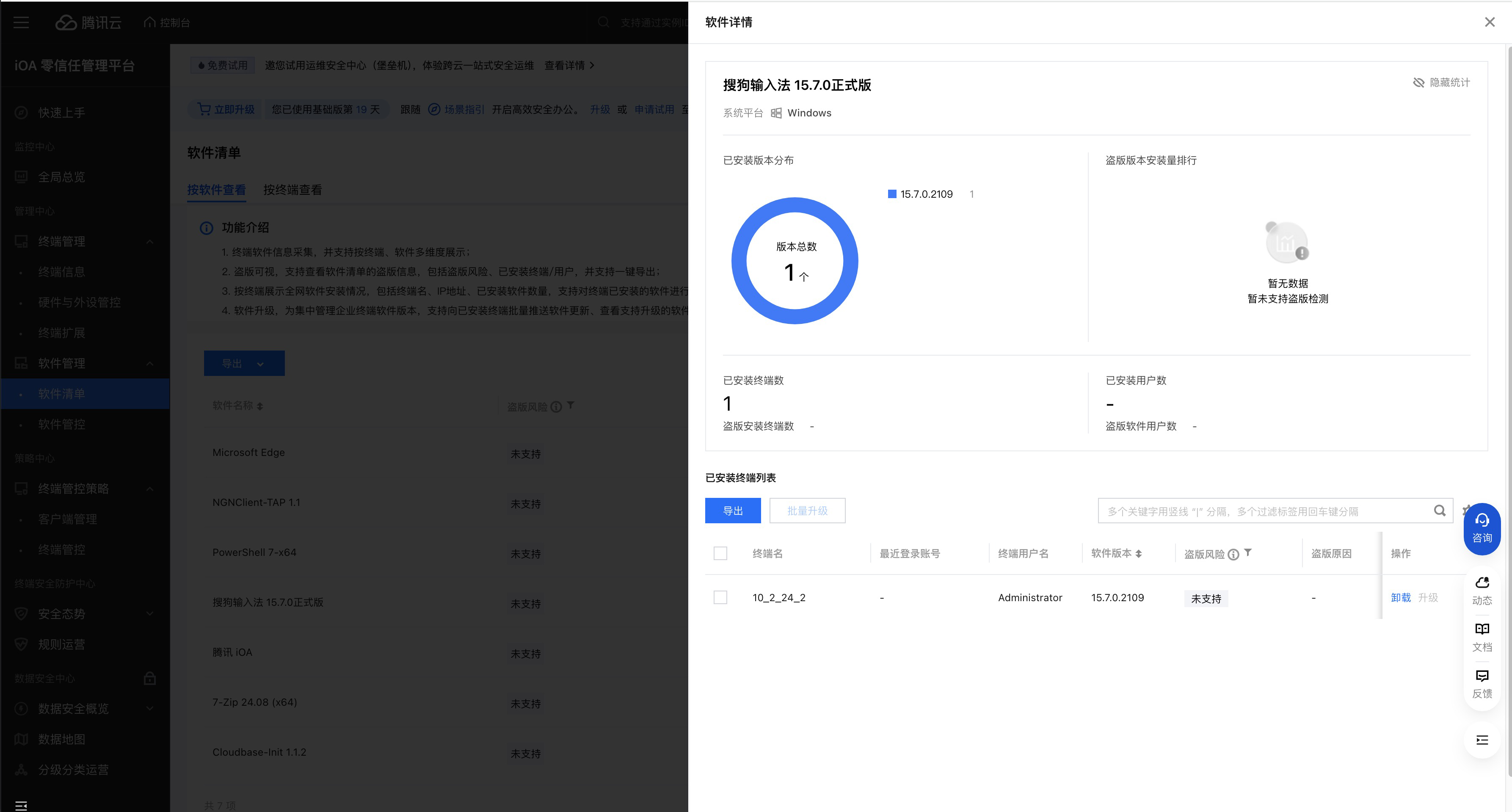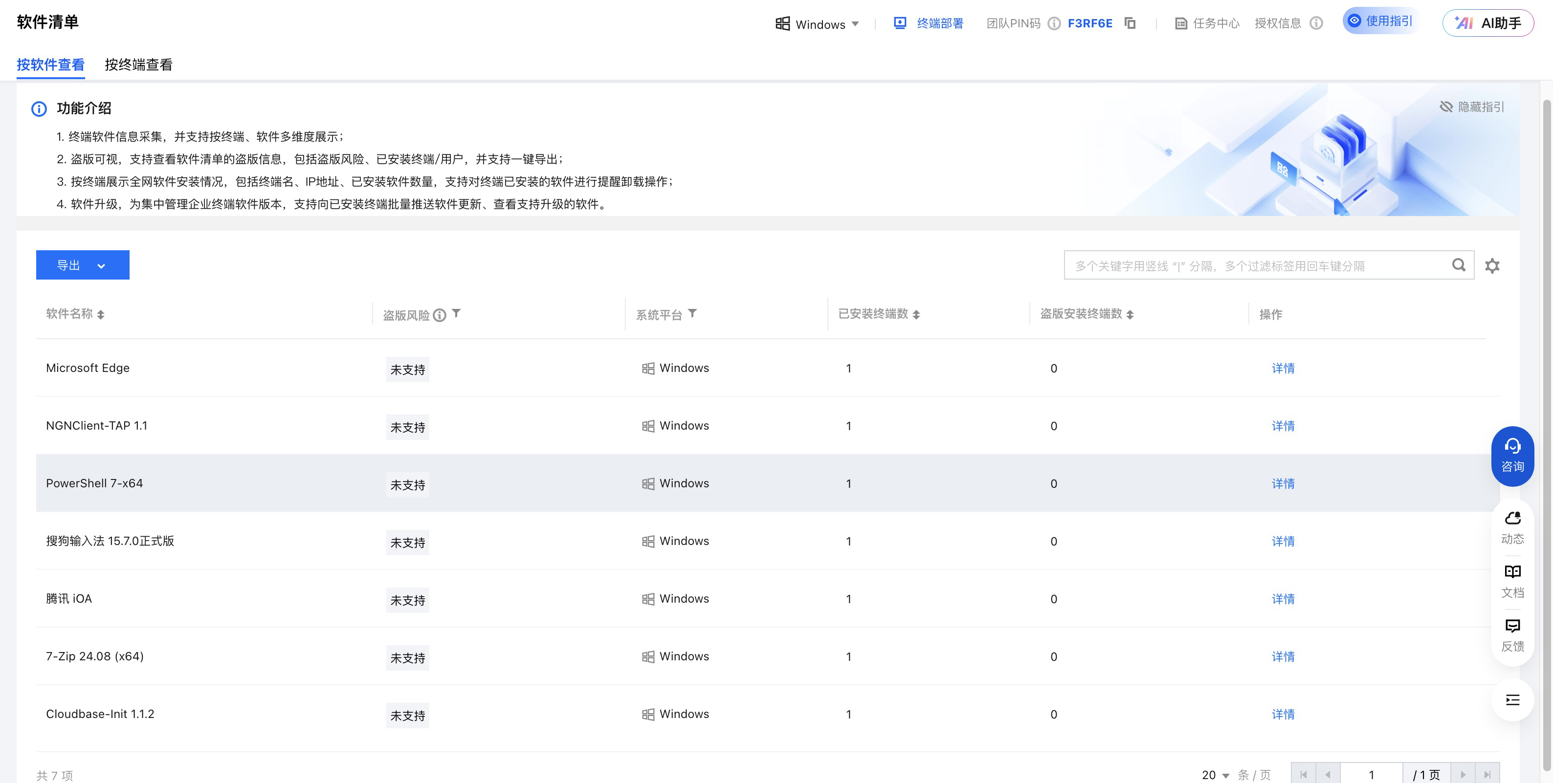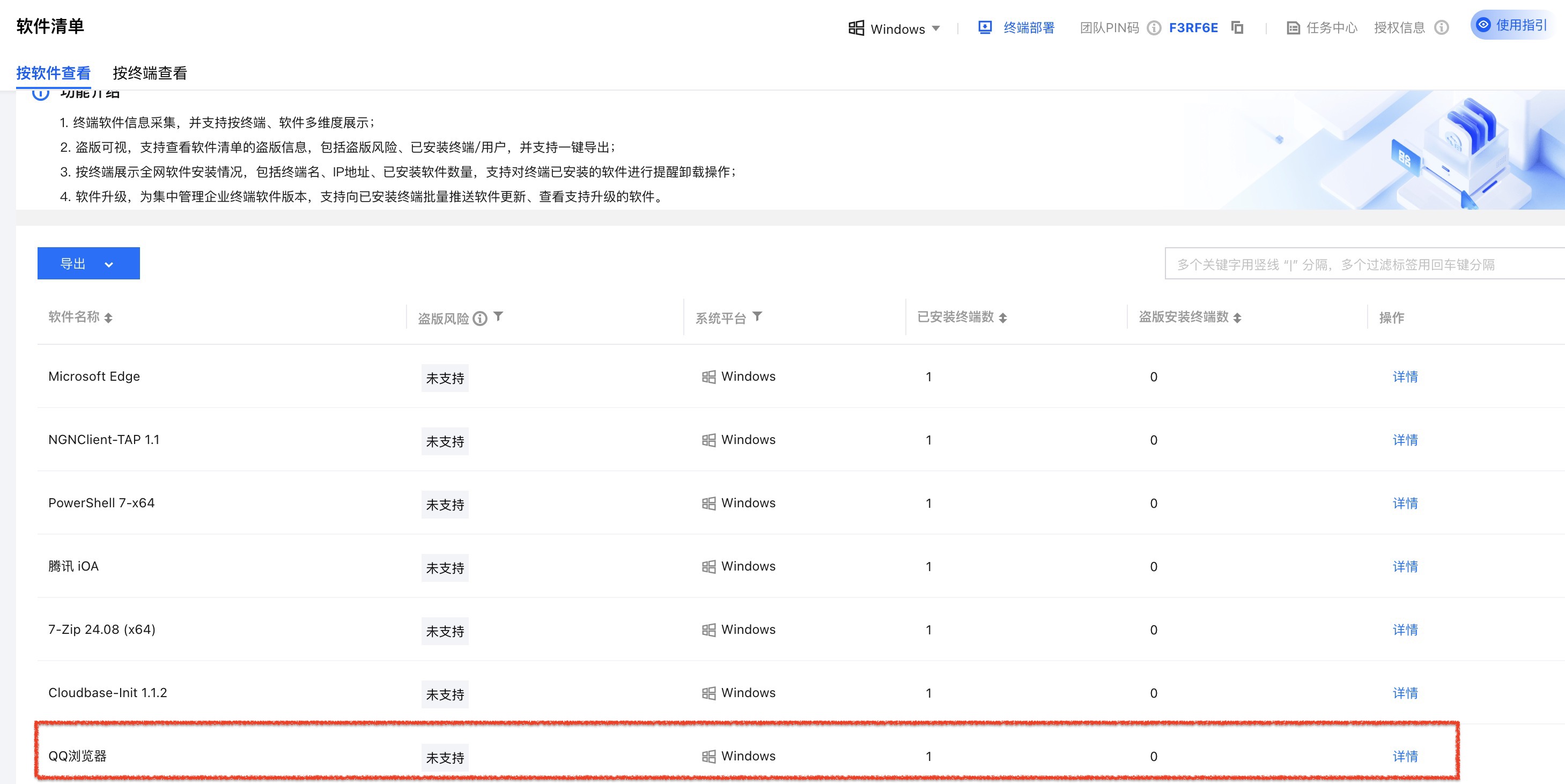 每条软件记录中,都会展示安装的系统、已安装的终端数,点击详情,我们就可以看到已安装软件的版本型号、盗版风险和已安装终端列表。