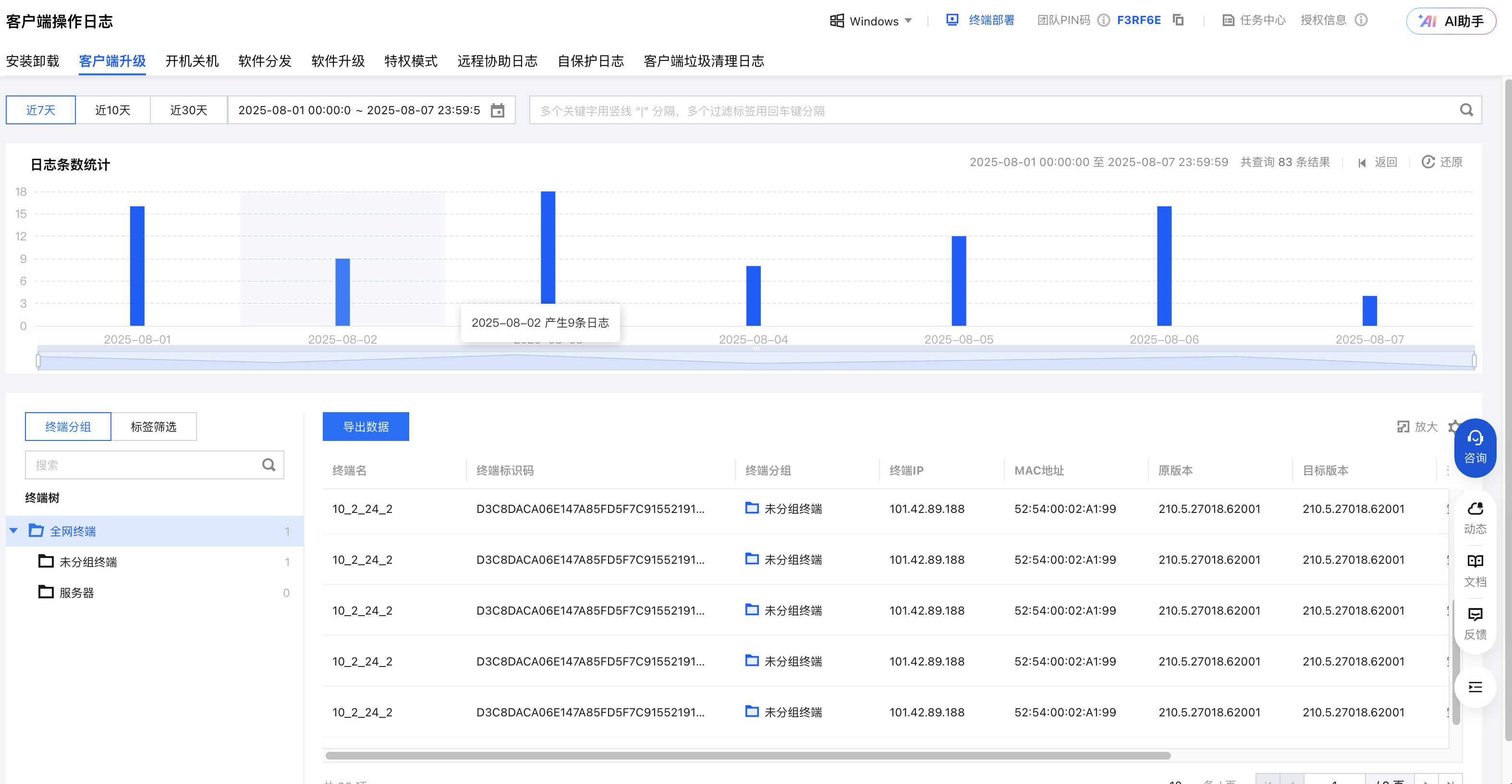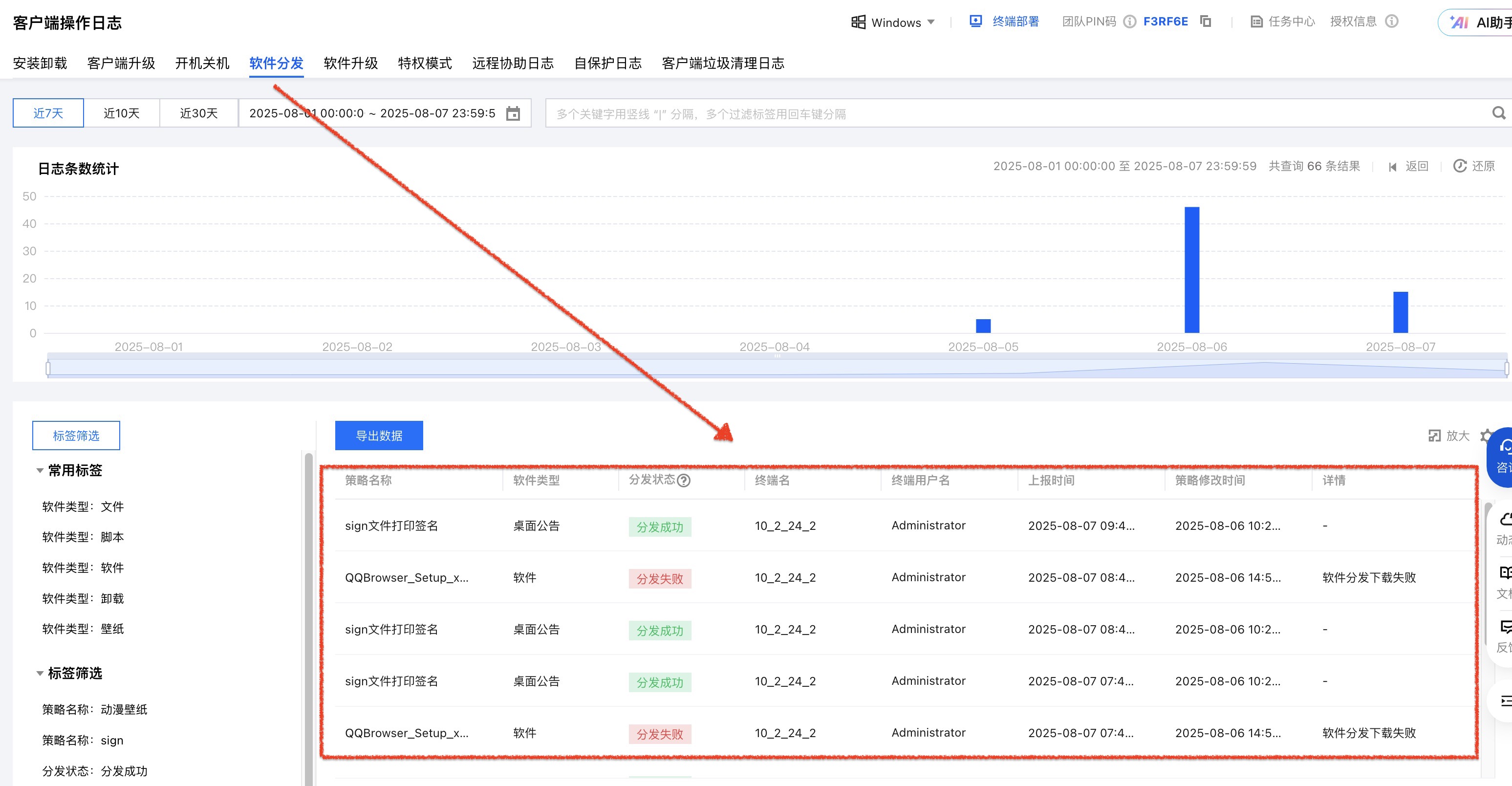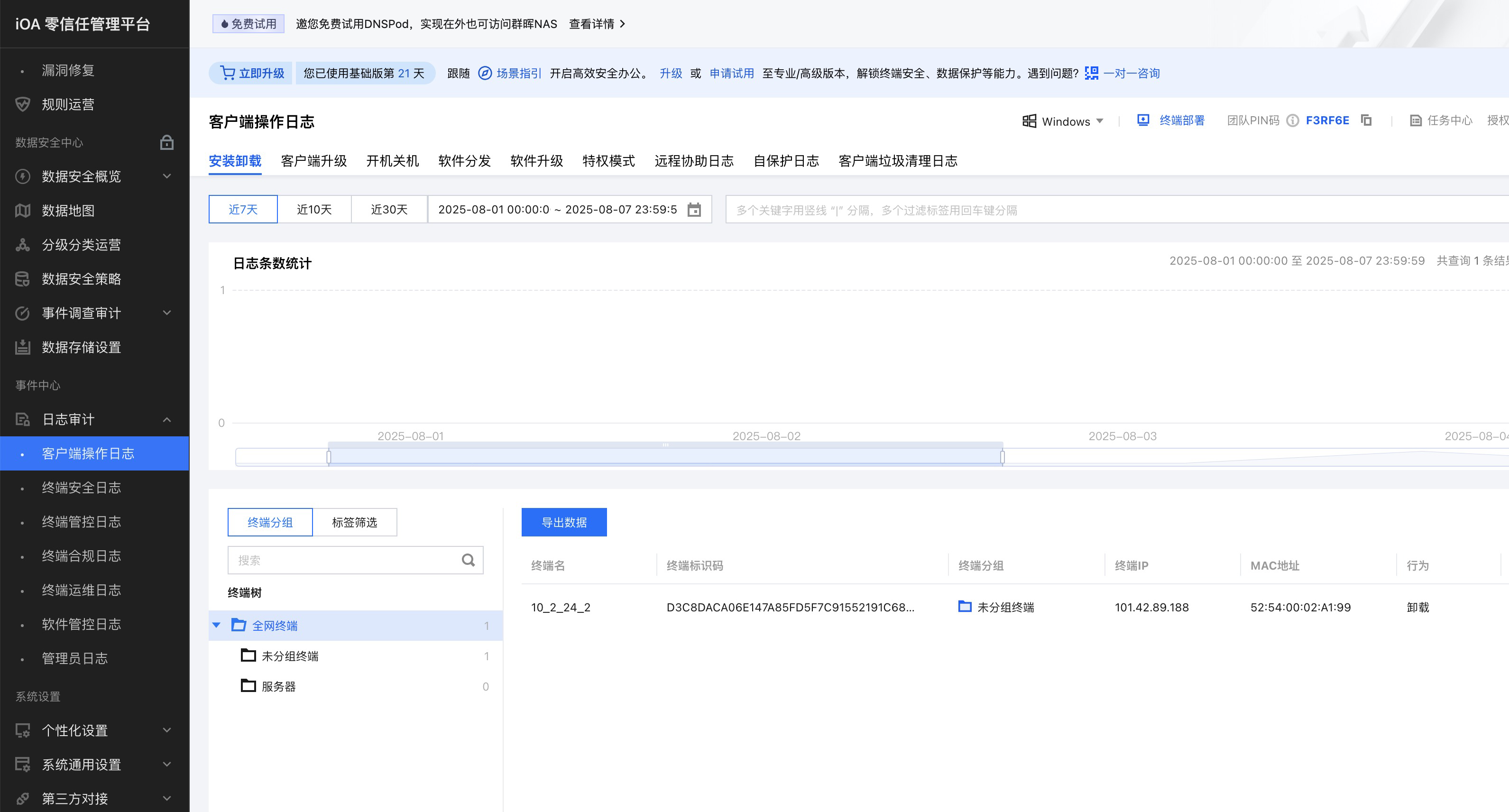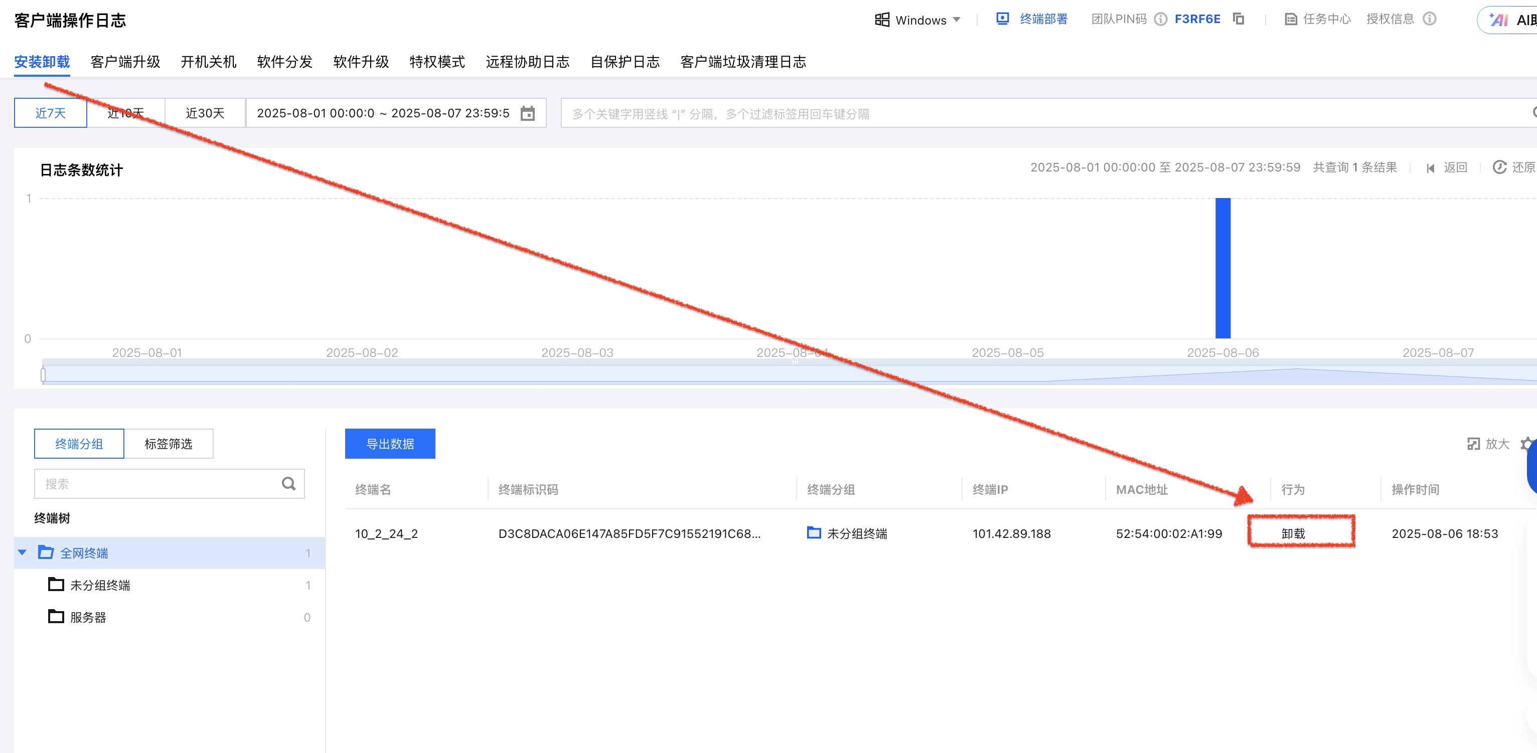 客户端操作日志就是安装了腾讯 iOA 用户终端的操作日志,如上图所示,包括安装卸载、升级以及软件分发等日志。因为我之前卸载重装了一次 iOA,所以在上图的安装卸载重,可以看到一条卸载日志记录。