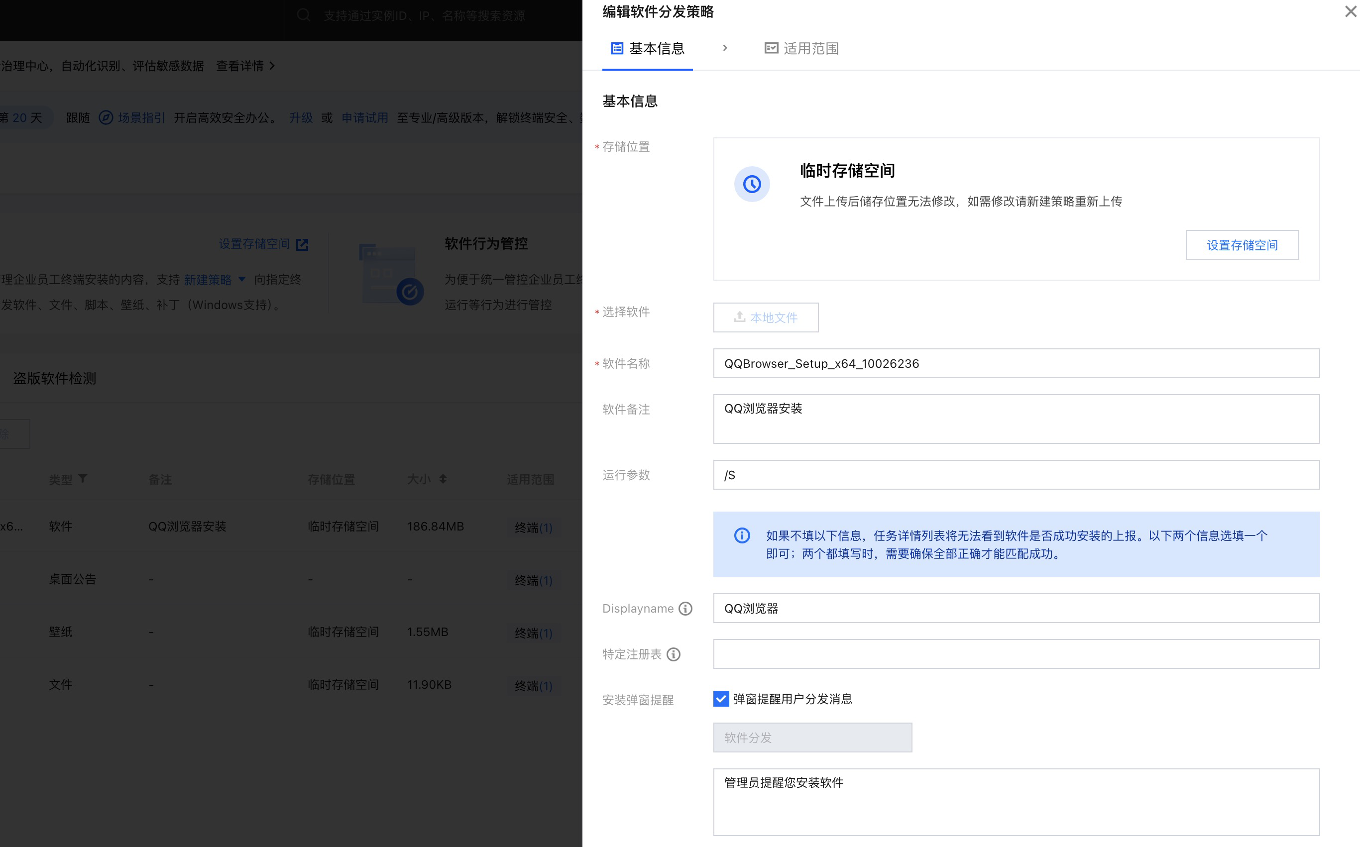 例如我想让所有的终端都安装QQ浏览器,于是我新建一个软件分发策略,上传本地的QQ浏览器安装包,运行参数填写 /S ,用来启动静默安装模式自动安装,不显示任何用户界面。