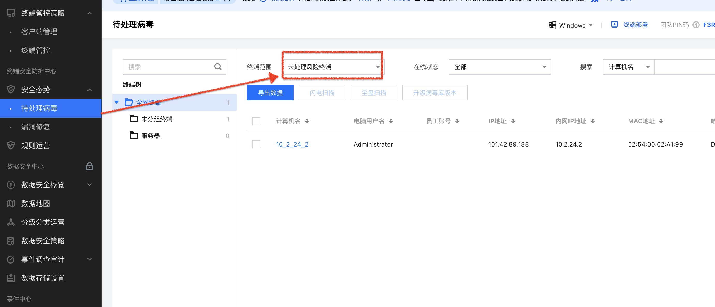 在 iOA 管理平台找到终端安全防护中心,在待处理病毒下找到 未处理风险终端。