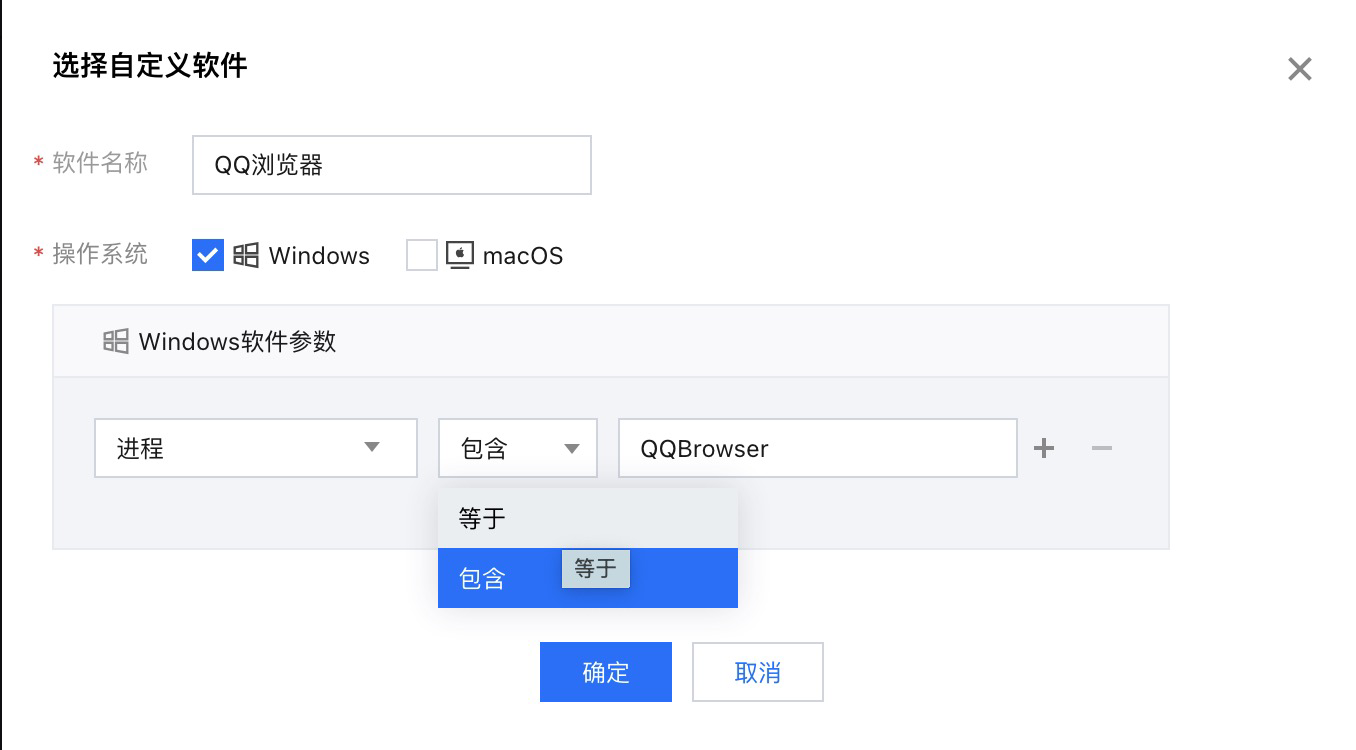 在自定义软件中,我们填写软件名称,然后设置软件进程参数条件,以此来匹配QQ浏览器的进程,这里我使用的是 包含 条件,只要进程包含 QQBrowser 的软件都无法运行。