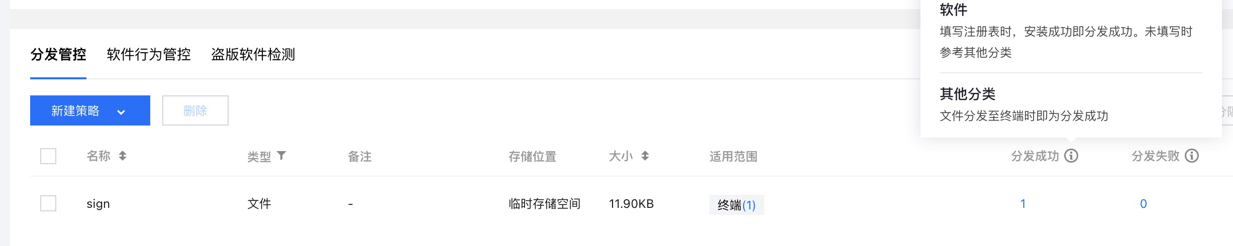 点击保存,就完成了文件分发策略的创建,也可以看到在 分发成功 这一栏数量为1,表示已经成功分发到1个终端上了。