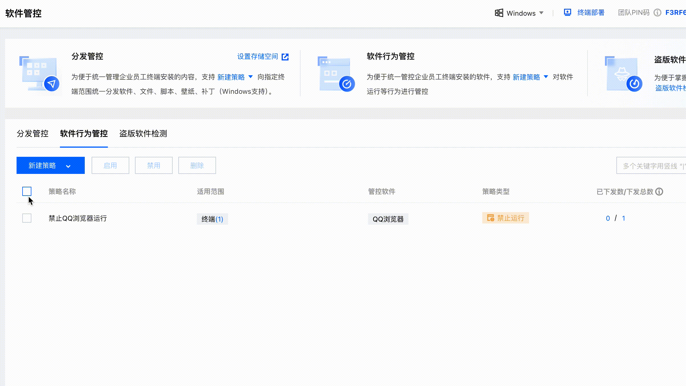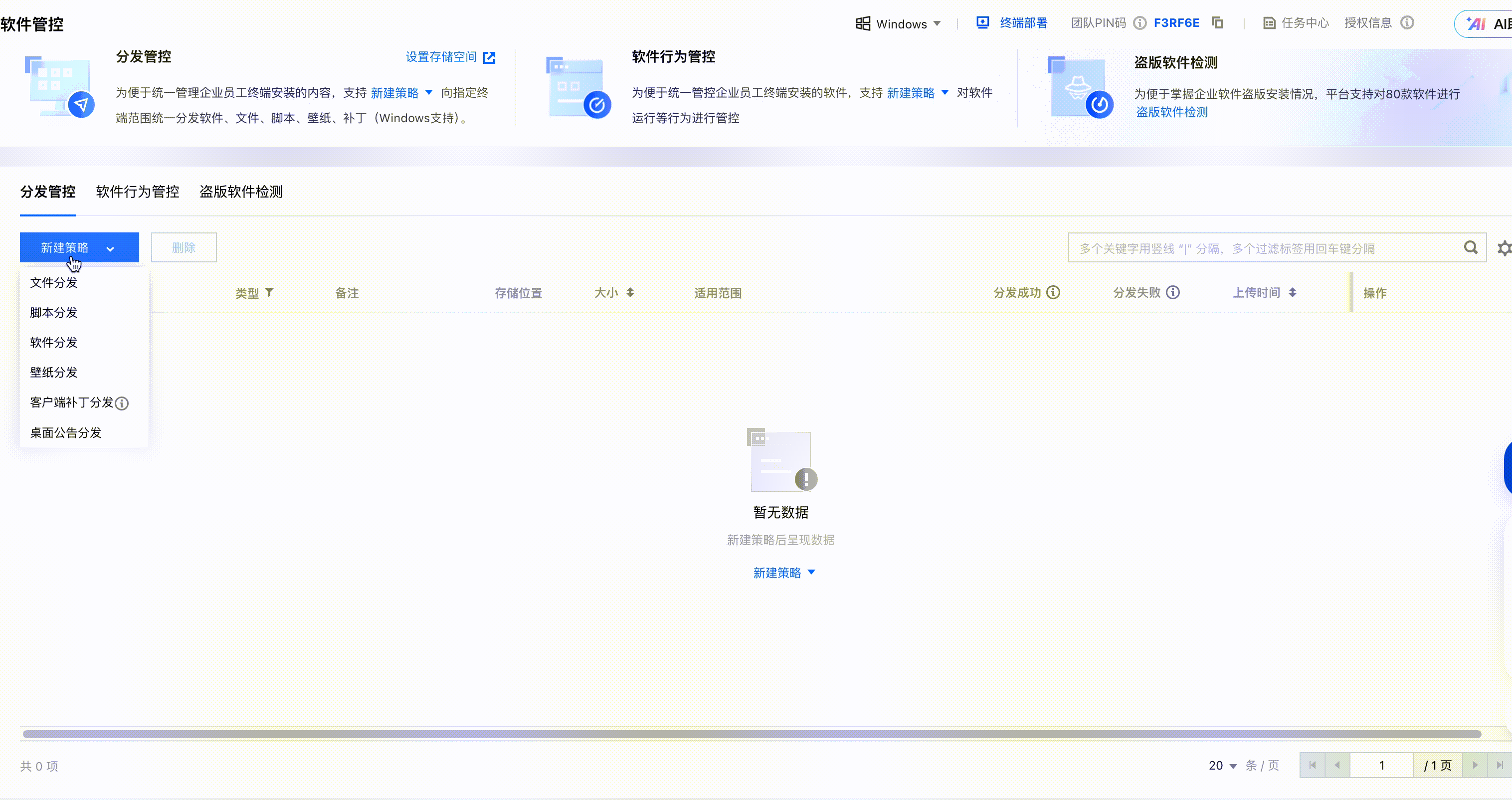 在软件管控下有三个功能菜单:分发管控、 软件行为管控 和 盗版软件检测。