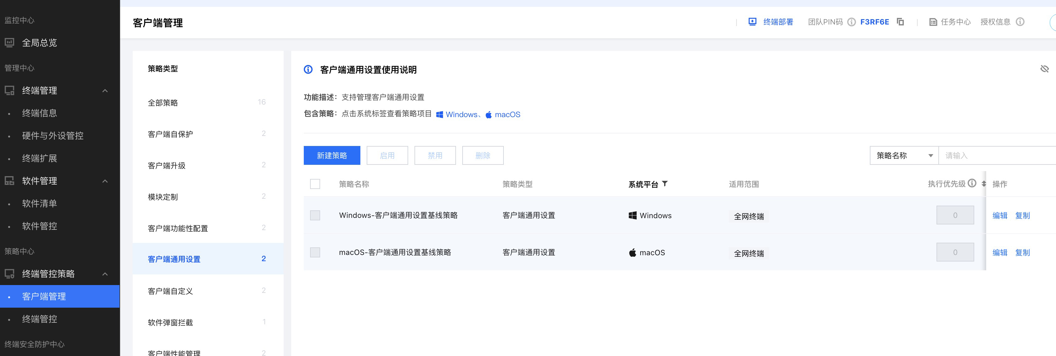 如上图所示,这些信息是没有展示的,需要在 终端管控策略 的客户端管理中,找到 客户端通用设置 开启运行状态监测开关。