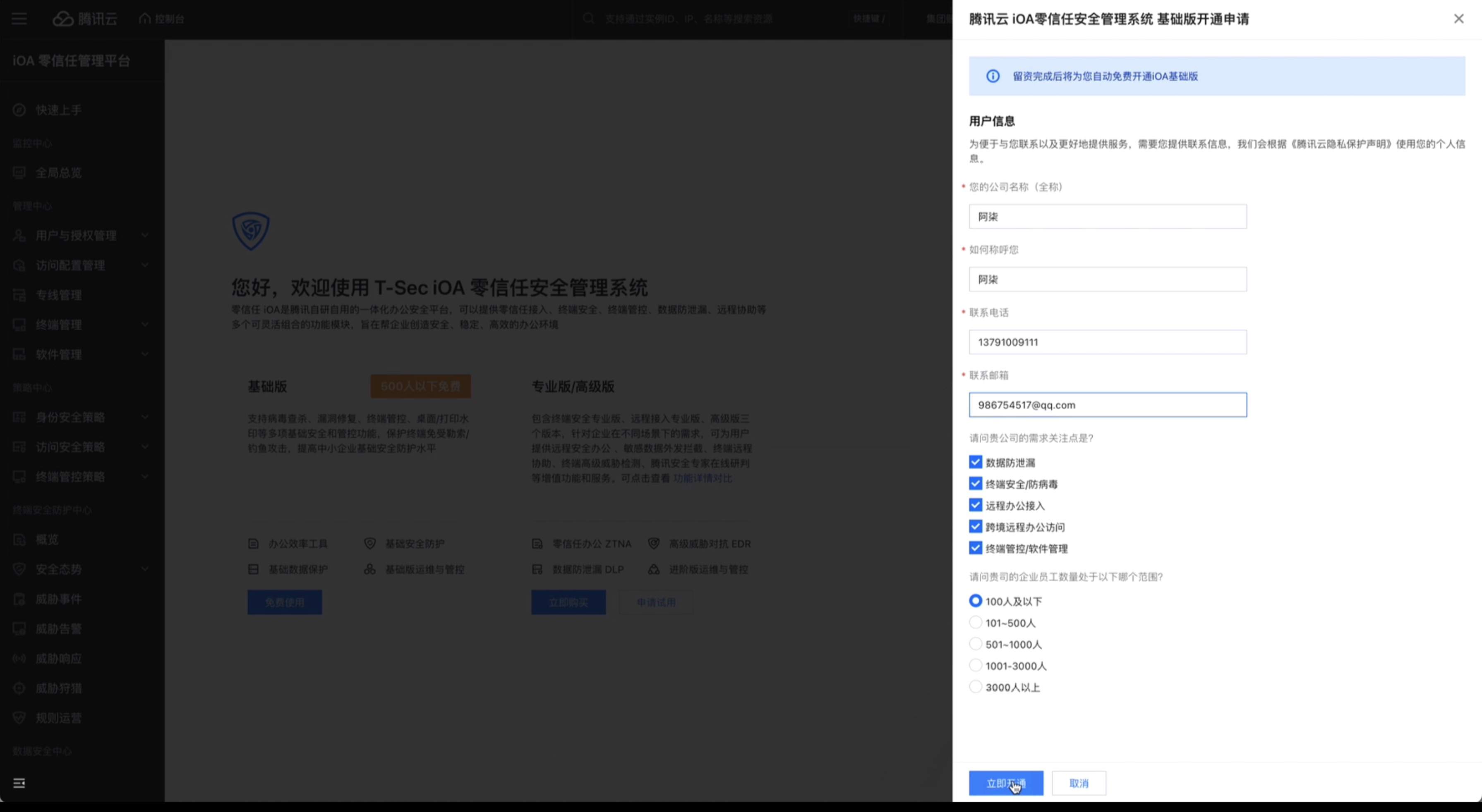 然后就进入了 iOA 的控制台,在进入控制台之后,需要填写一些信息完成免费基础版的申请。
