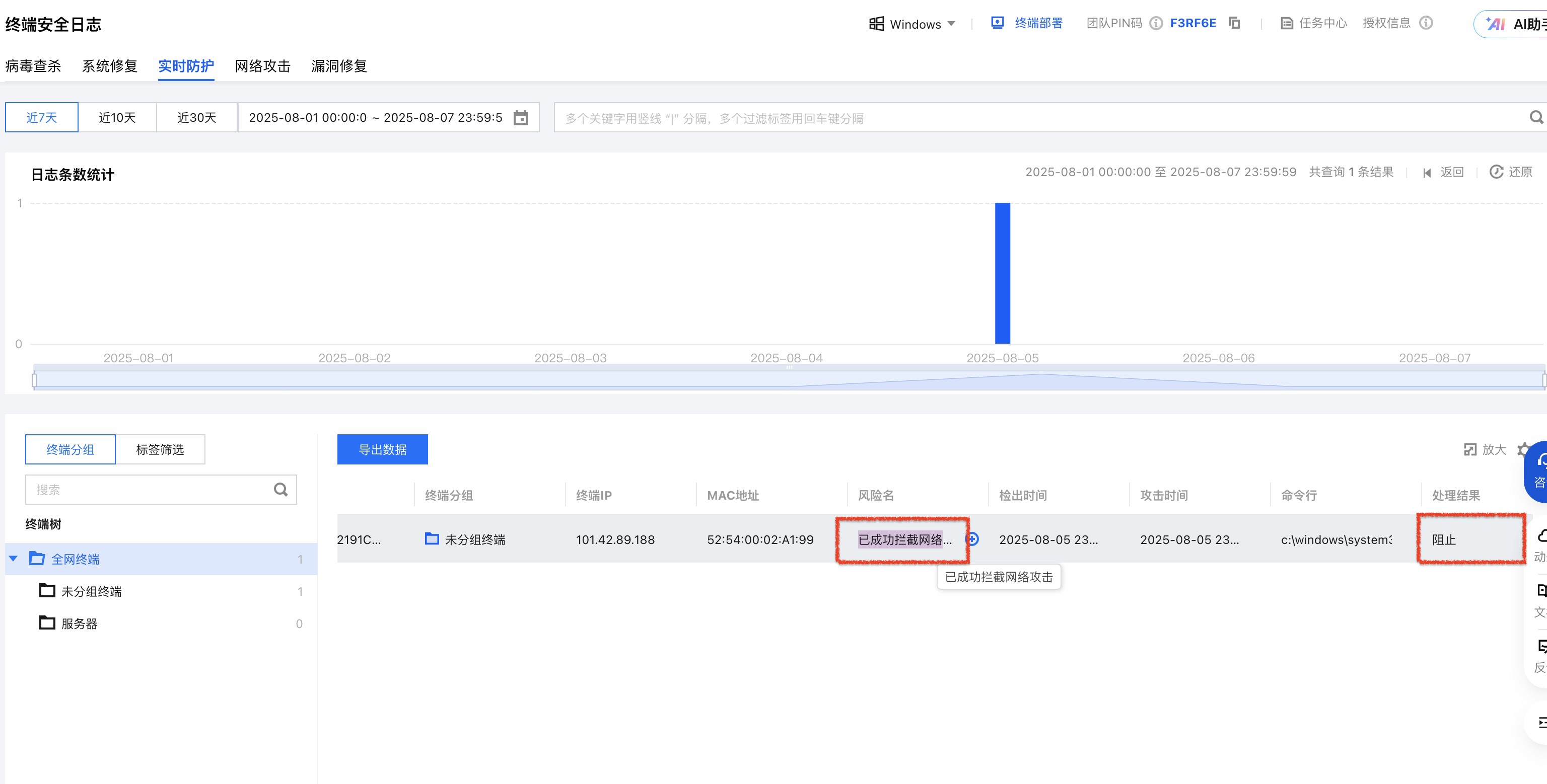 在 实时防护 页面可以看到 iOA 终端在运行期间,拦截的风险日志。如下图所示,成功组织了一次网络攻击。