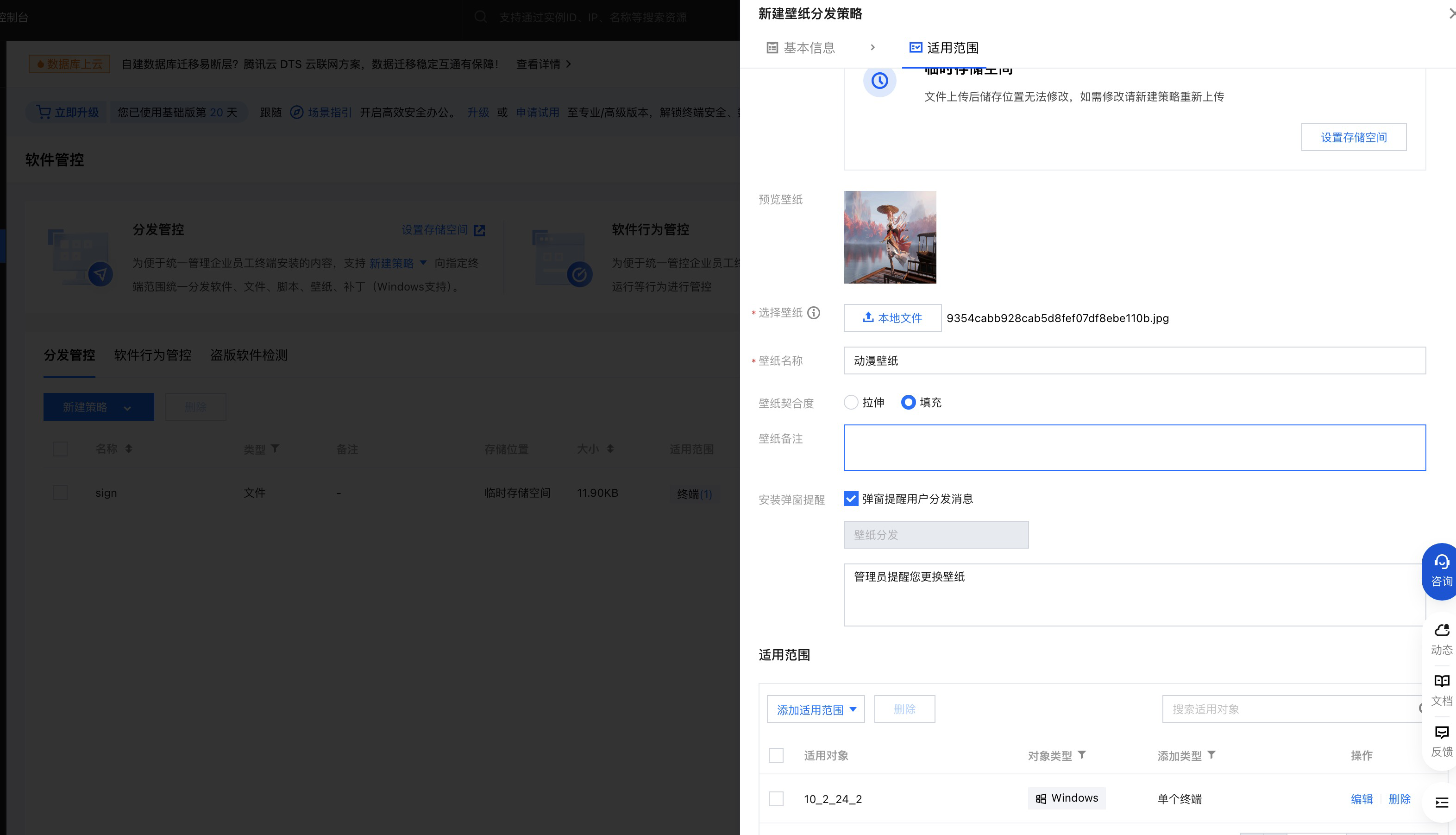 新建一个壁纸分发策略,上传下载到本地的壁纸。