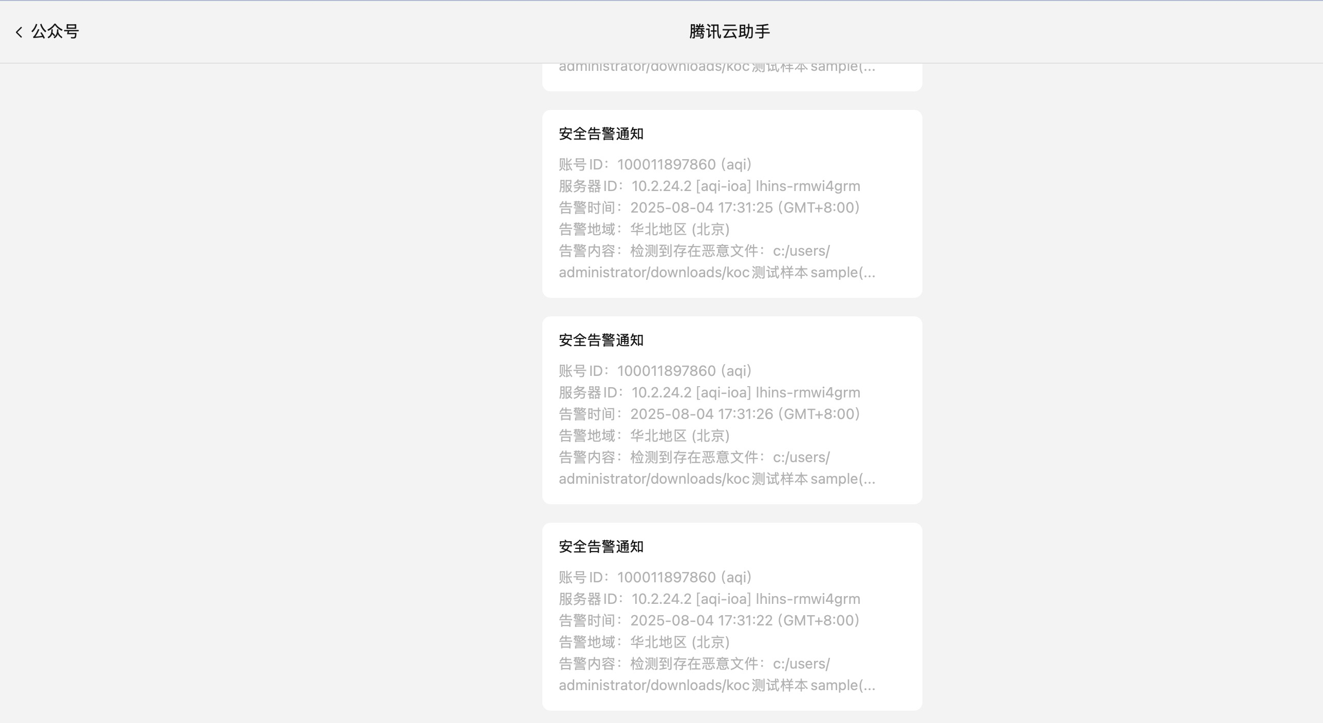 然后紧接着 腾讯云助手 也发来了安全告警通知。