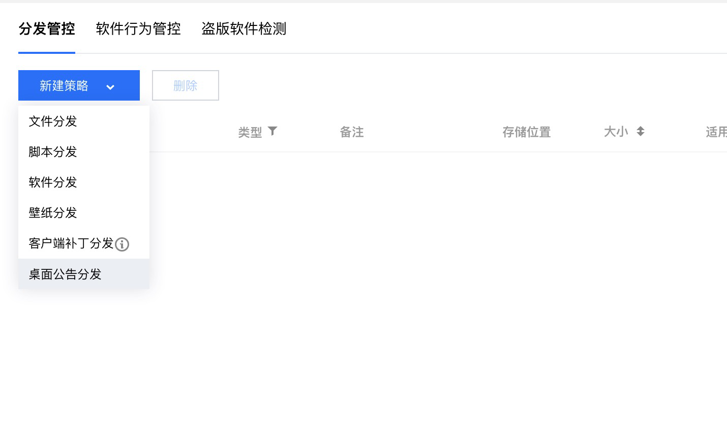分发管控支持向指定终端统一分发软件、文件、脚本、壁纸、桌面公告、客户端补丁(Windows 支持)。